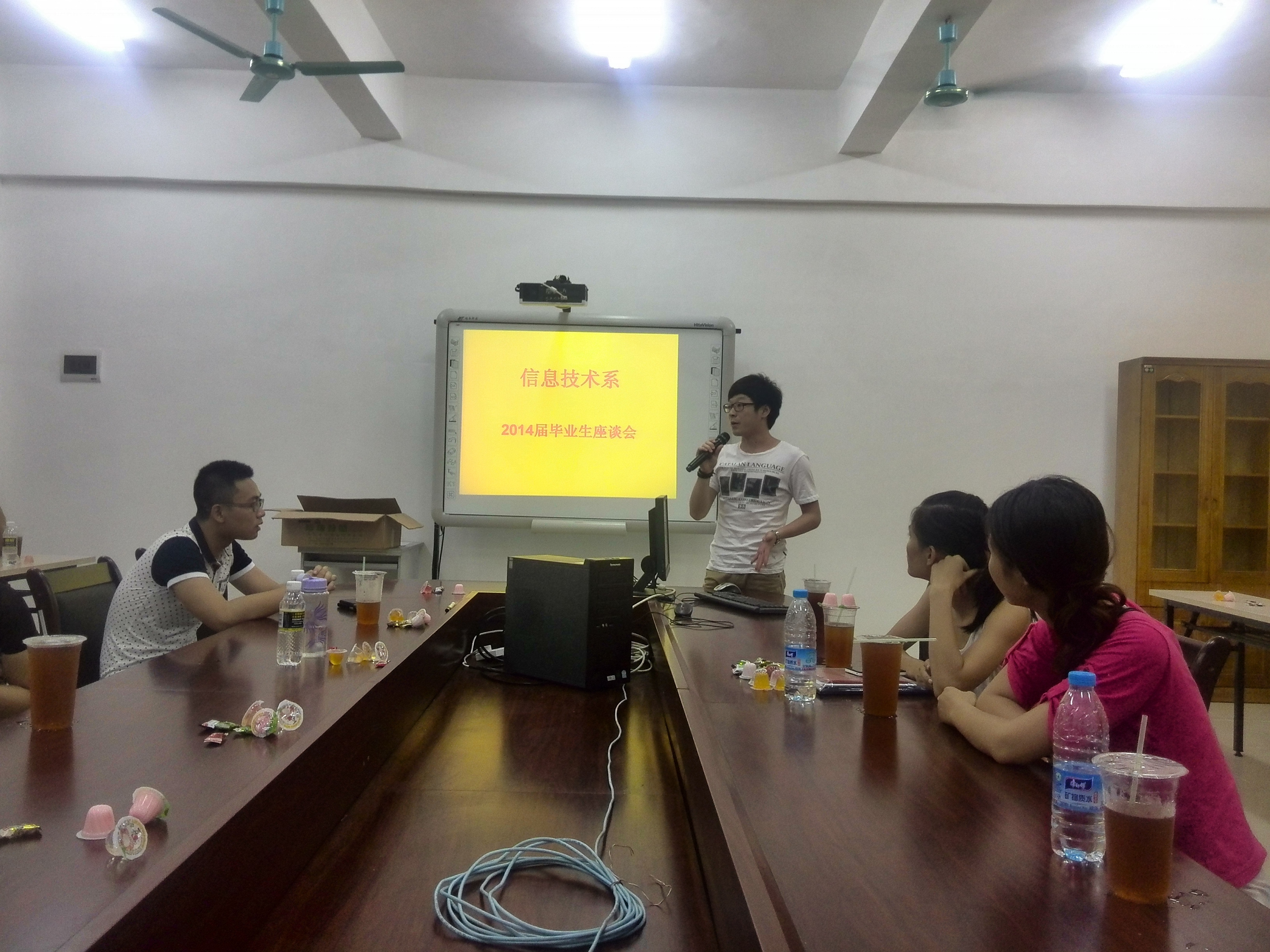 本系6月19日讯(信息技术系 钟超撰稿)6月18日下午16点整,本系在2栋406召开2014届毕业生代表座谈会。系党总支书记陈继敏、系副主任王凡帆、系学工办主任陈亚芳、系学工办副主任梁其钰出席会议,第八届团总支学生会主席团、12、13级各班级负责人及各个专业的毕业生代表参加了座谈会。会议由学工办主任陈亚芳主持。