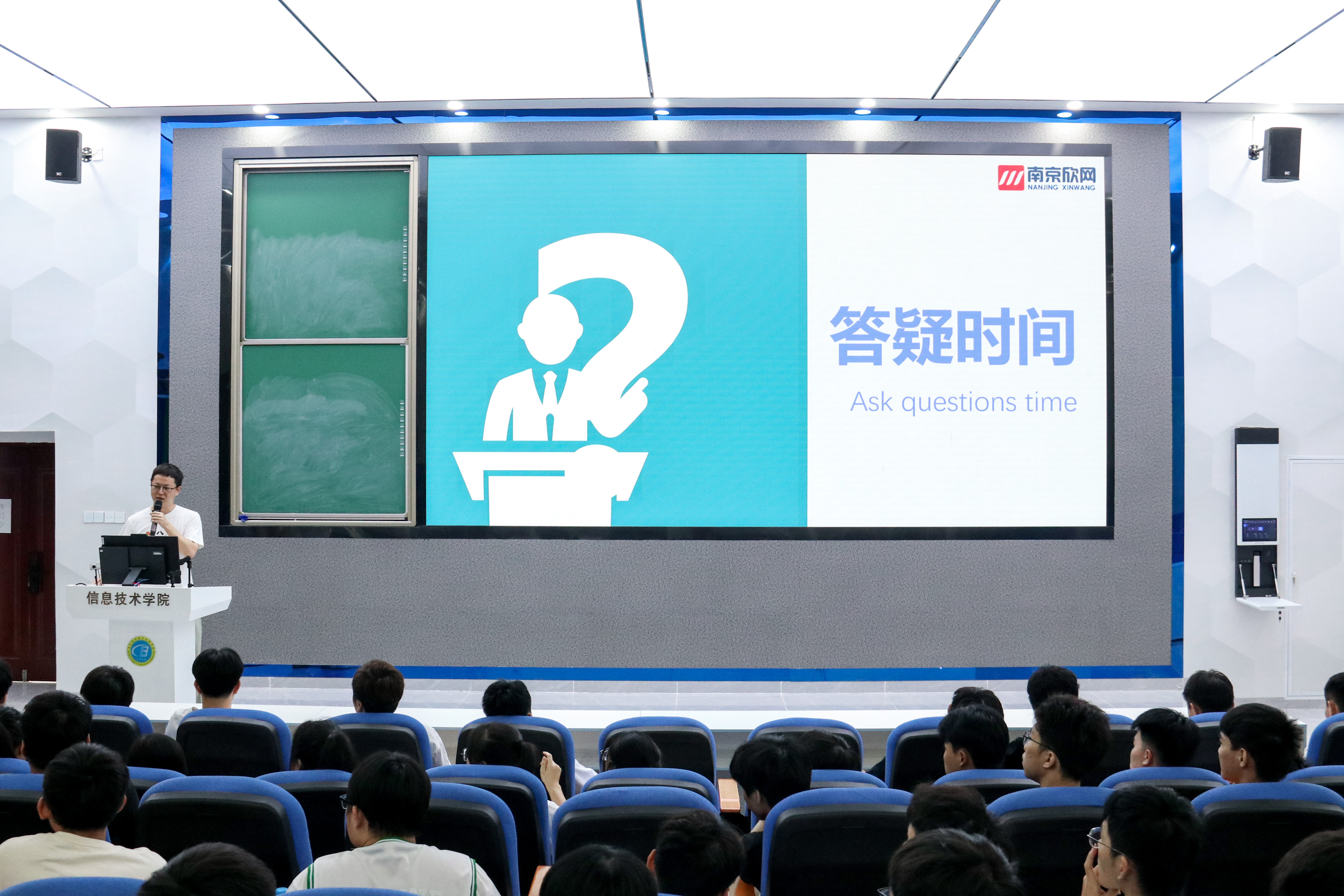 招聘会现场,南京欣网通信科技股份有限公司宣讲人向在场的同学介绍了公司的发展历程以及当下规模,并就岗位概况、薪资待遇、证书考取、未来发展、办公环境、公司结构进行了全面地讲解。在交流互动环节中,同学们就工作地点、工作岗位、工作环境提出问题,宣讲人为同学们答疑解惑,了解了大家的就业意愿,现场氛围良好。