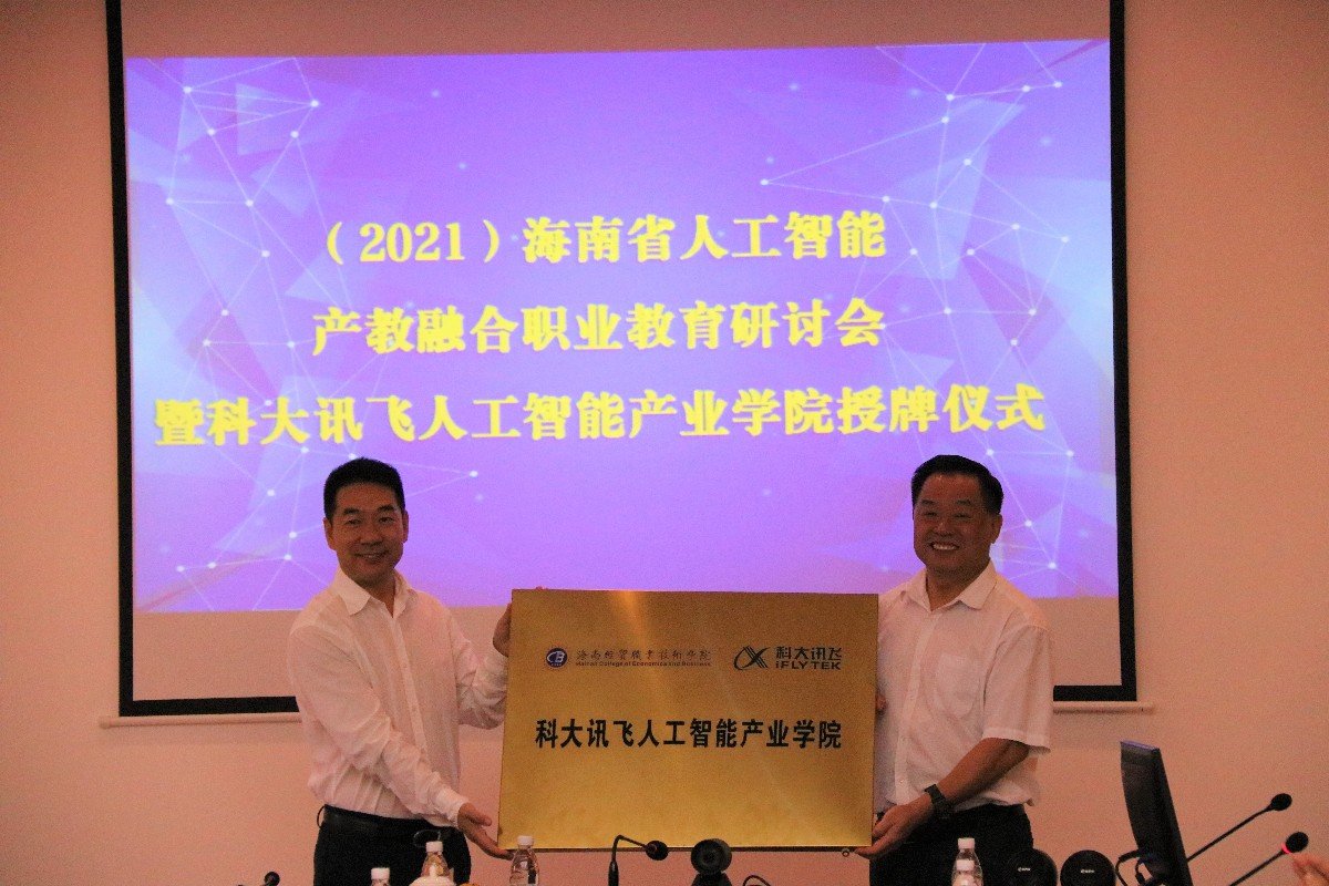 2021年11月2日,海南省人工智能产教融合职业教育研讨会暨“海南经贸-科大讯飞-人工智能产业学院”授牌仪式在海经贸举行。会议由海南经贸职业技术学院、海南省人工智能学会、科大讯飞股份有限公司联合主办,海南科技职业大学、海口经济学院、海南软件职业技术学院协办。