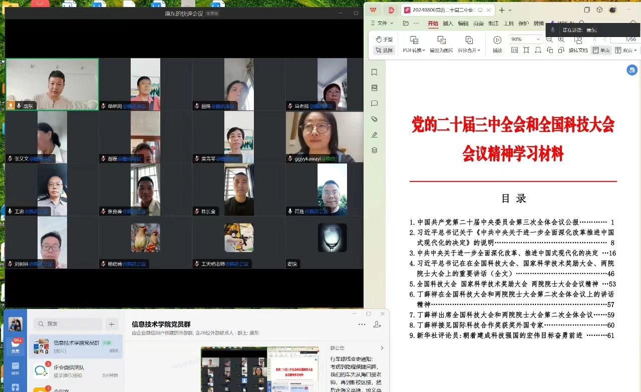 会上,康东同志带领大家研读《中国共产党第二十届中央委员会第三次全体会议公报》《中共中央关于进一步全面深化改革、推进中国式现代化的决定》原文,重点从会议概况、工作报告、中纪委报告、党章修改情况以及大会选举结果等多个方面,对党的二十届三中全会精神进行了系统传达和深入解读,确保每位党员都能全面、准确地理解和把握全会精神。