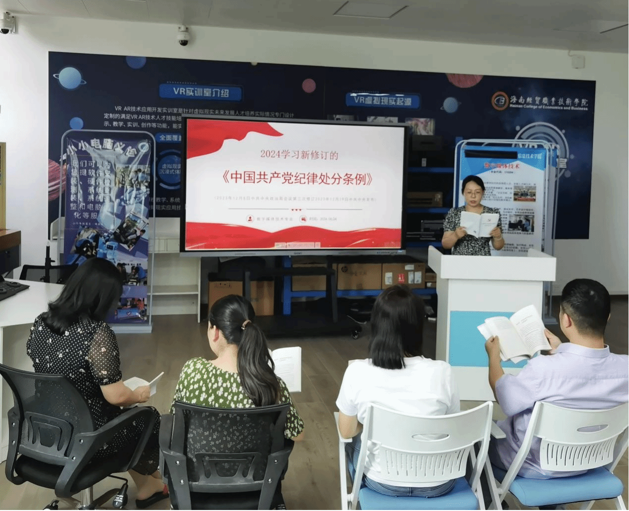 6月4日下午,太阳网集团tcy8722教工党支部开展《中国共产党纪律处分条例》专题学习会,会议由教工党支部书记康东主持,数字媒体技术专业教师党员们参加。