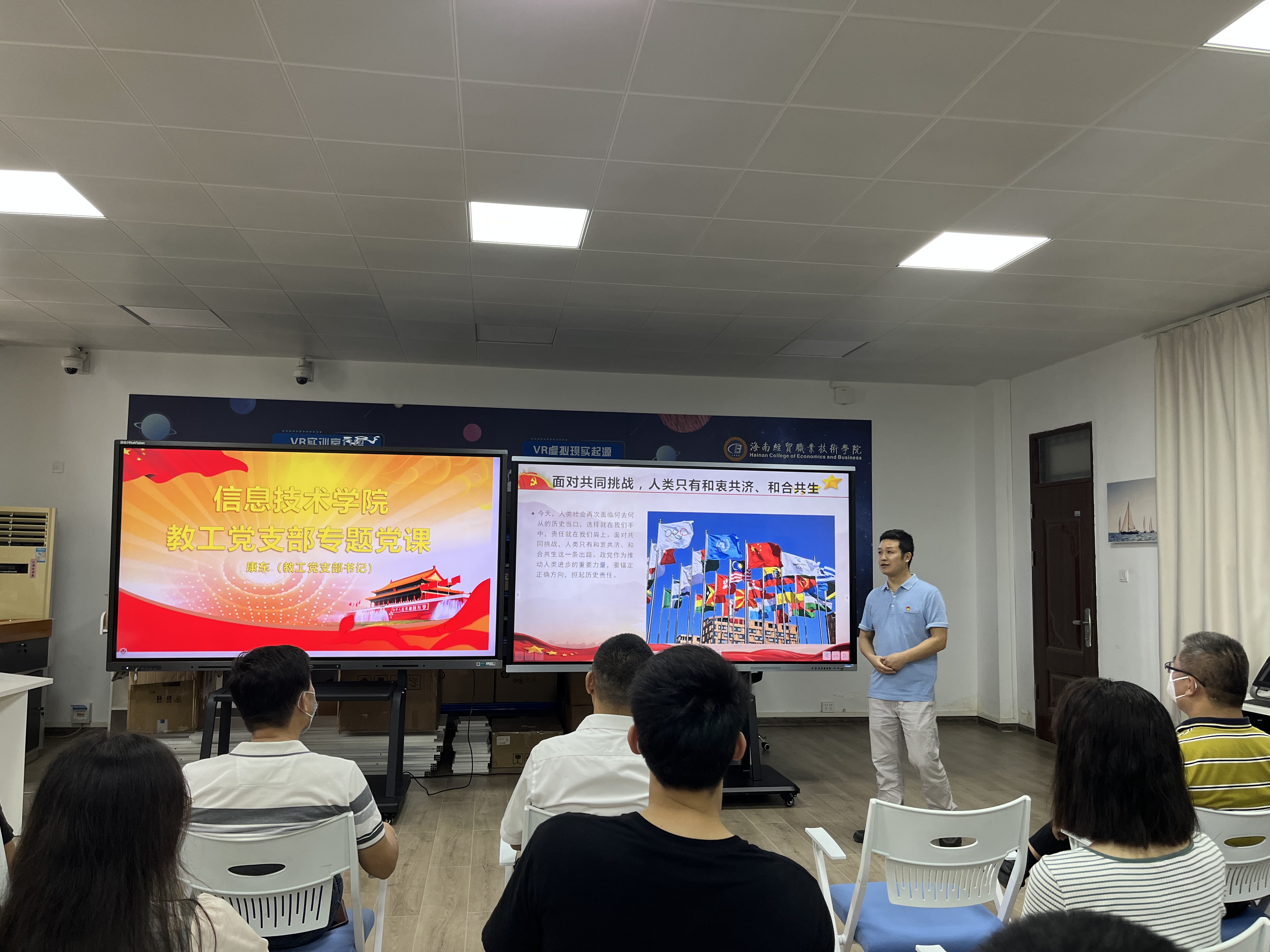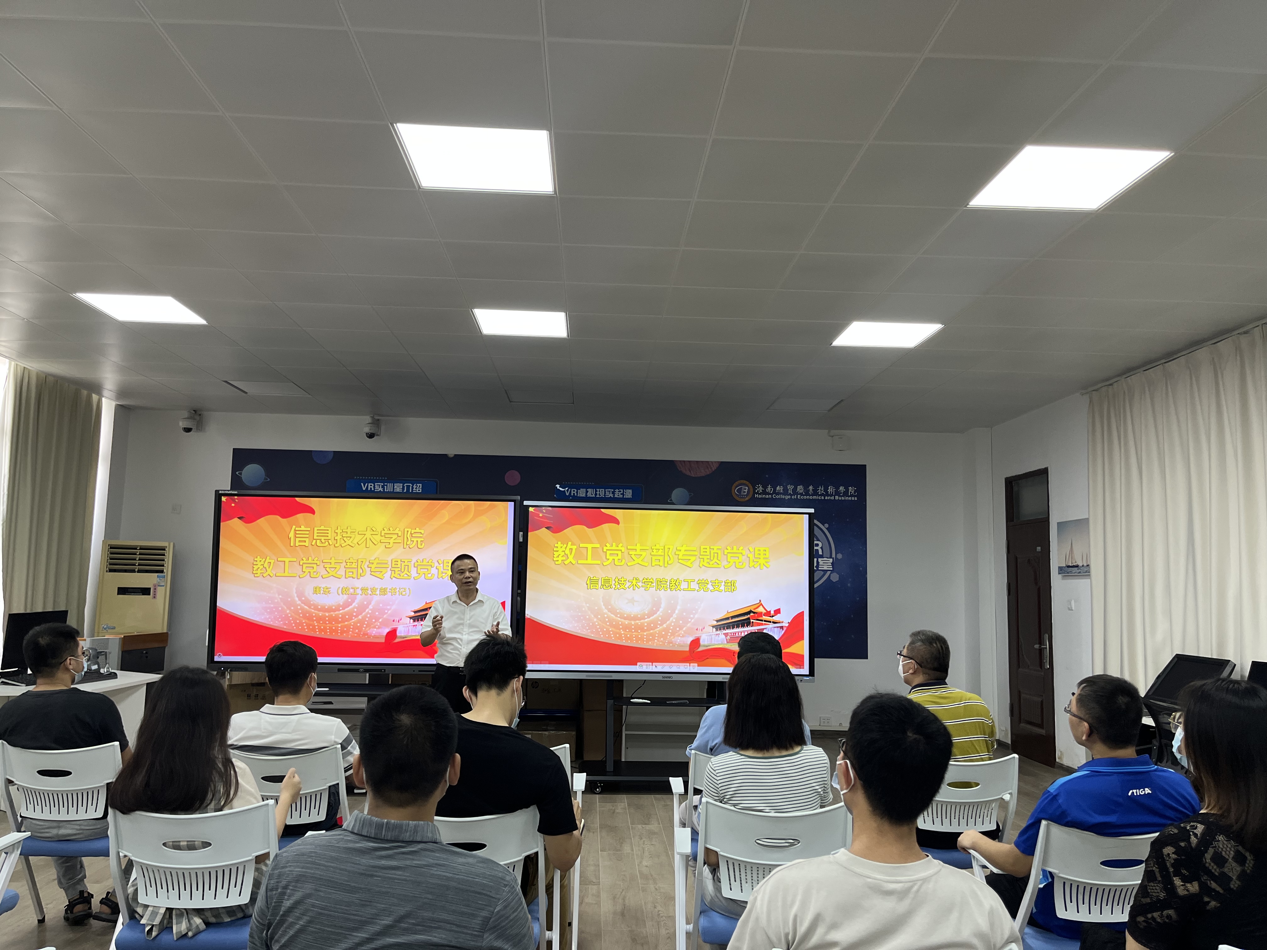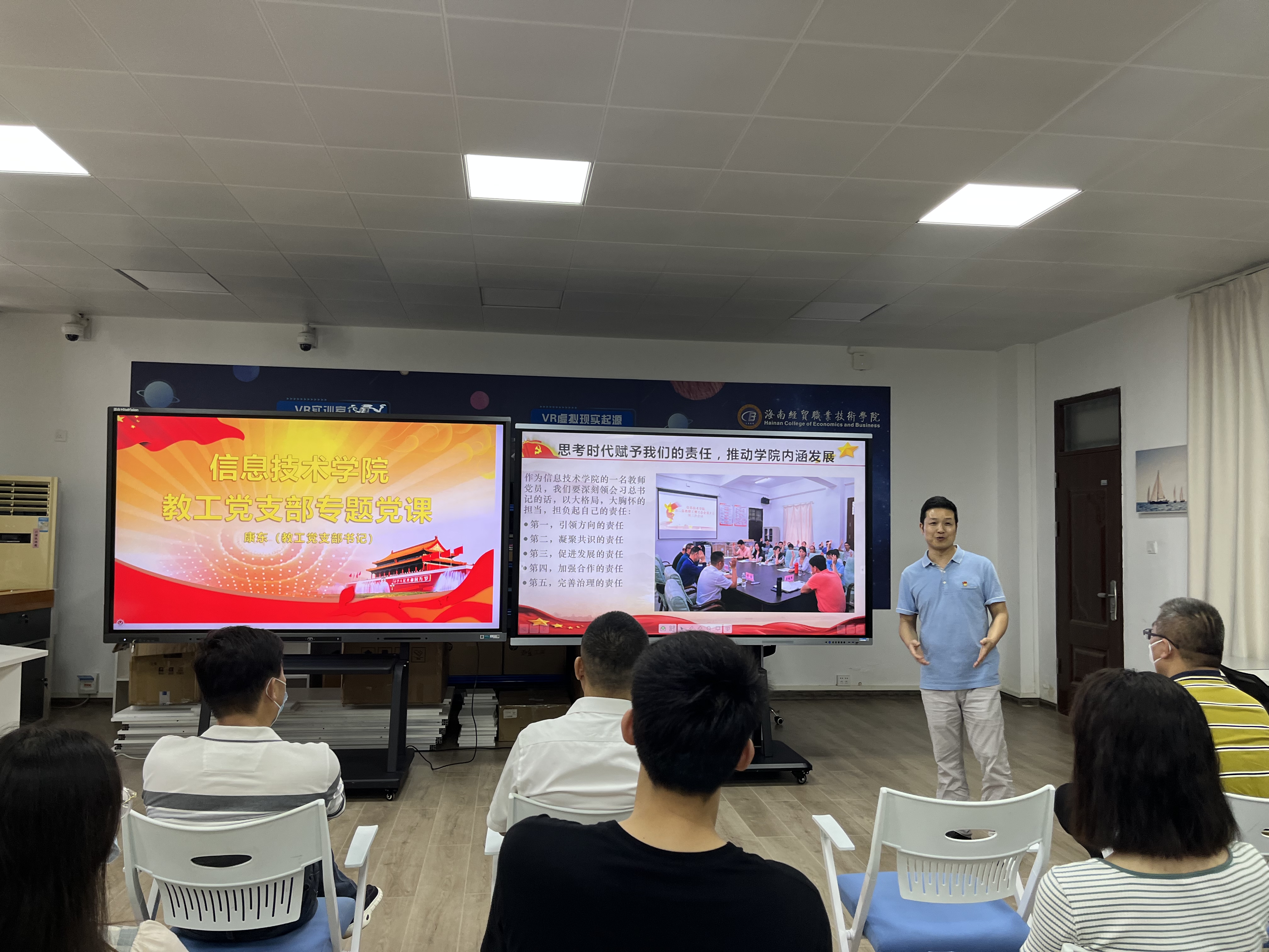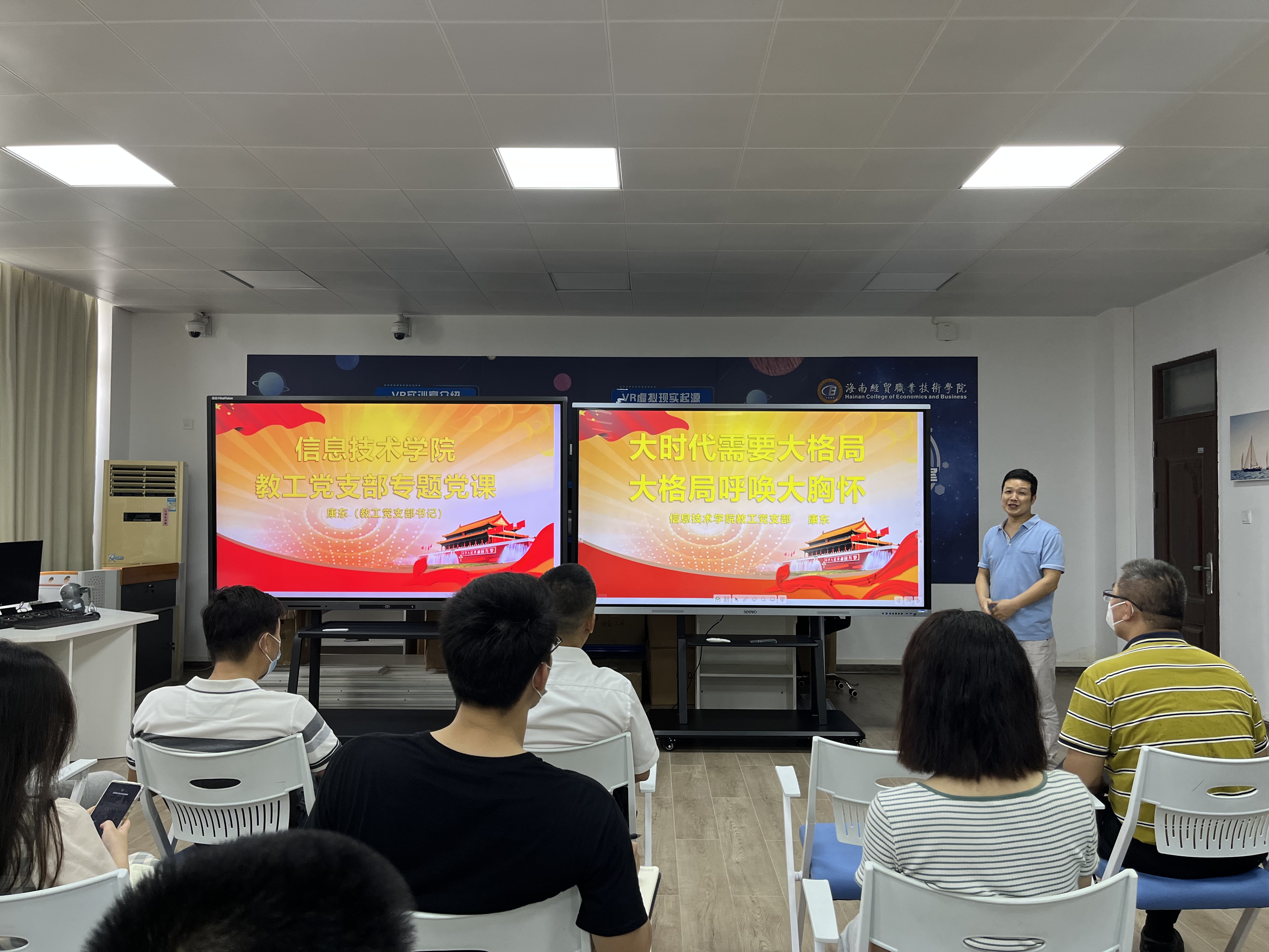 康东带领全体教工党员重温了习近平总书记出席中国共产党与世界政党领导人峰会上的讲话《大时代需要大格局,大格局呼唤大胸怀》精神,梳理了我党一贯的“大格局、大胸怀”工作理念和成效。并结合海南自由贸易港建设契机,讲述了我院四大专业的转型升级发展路径,未来发展目标。并以大格局,大胸怀的担当,激励全体党员同志担负起专业转型升级的历史使命和责任。