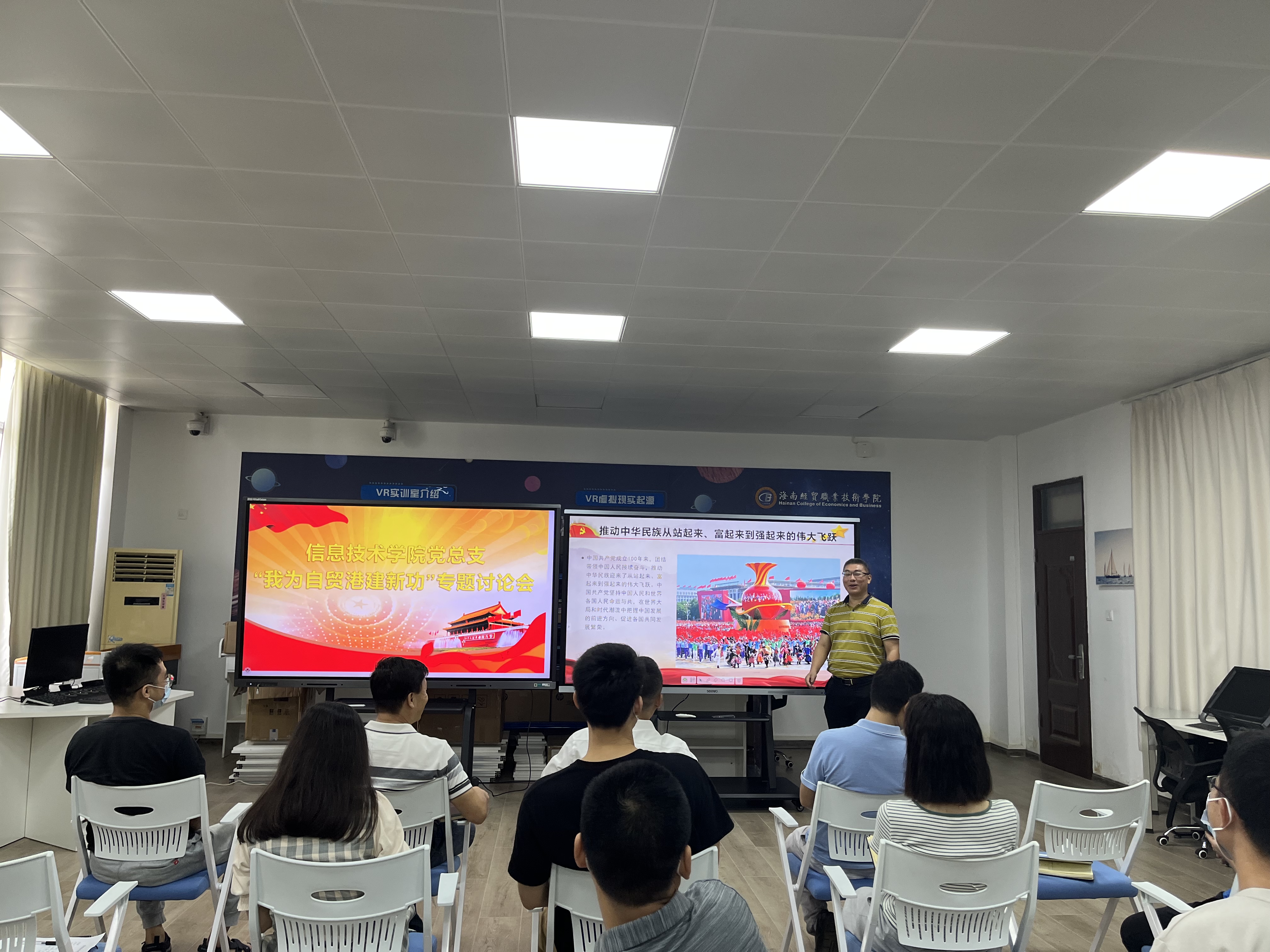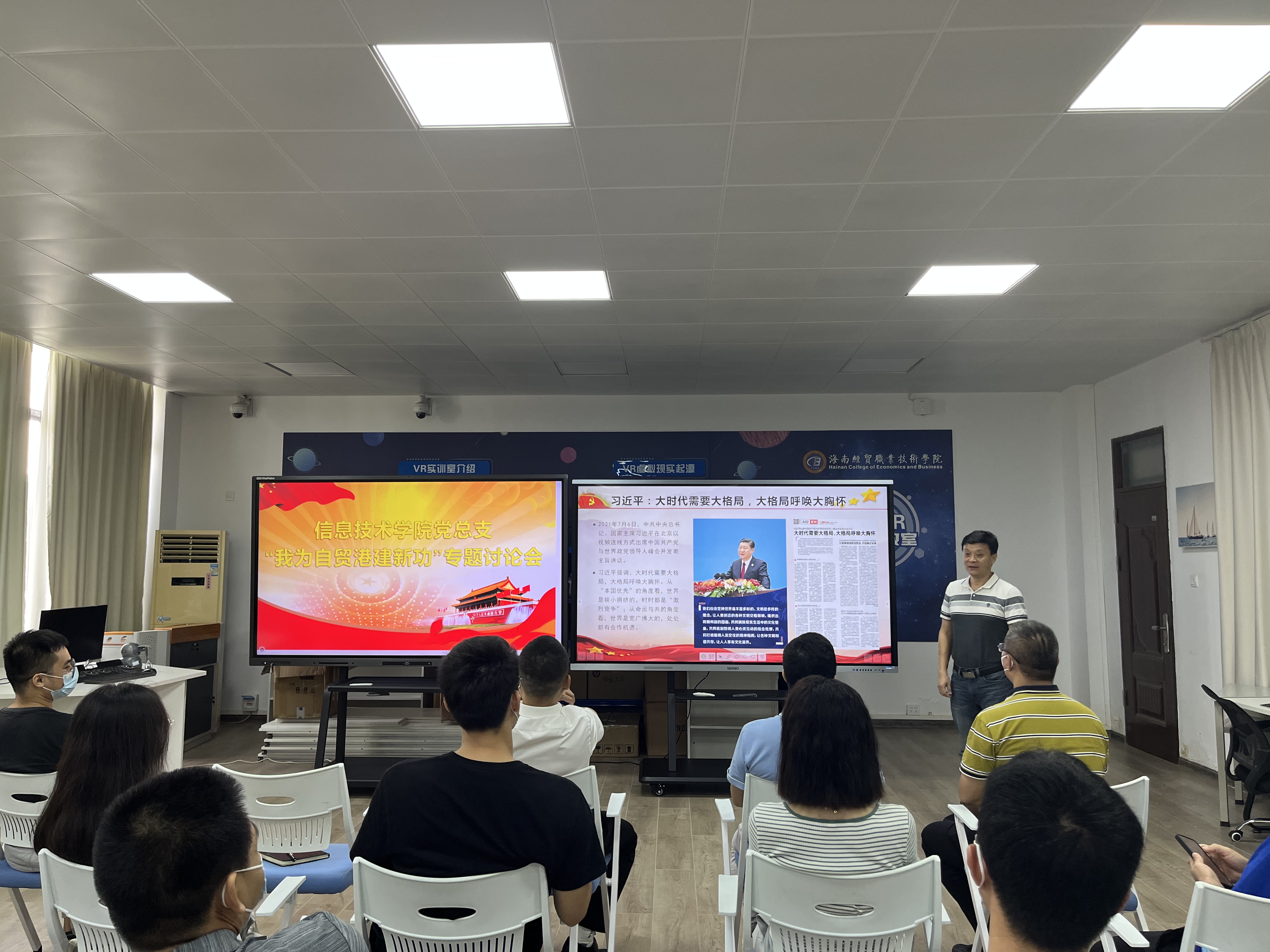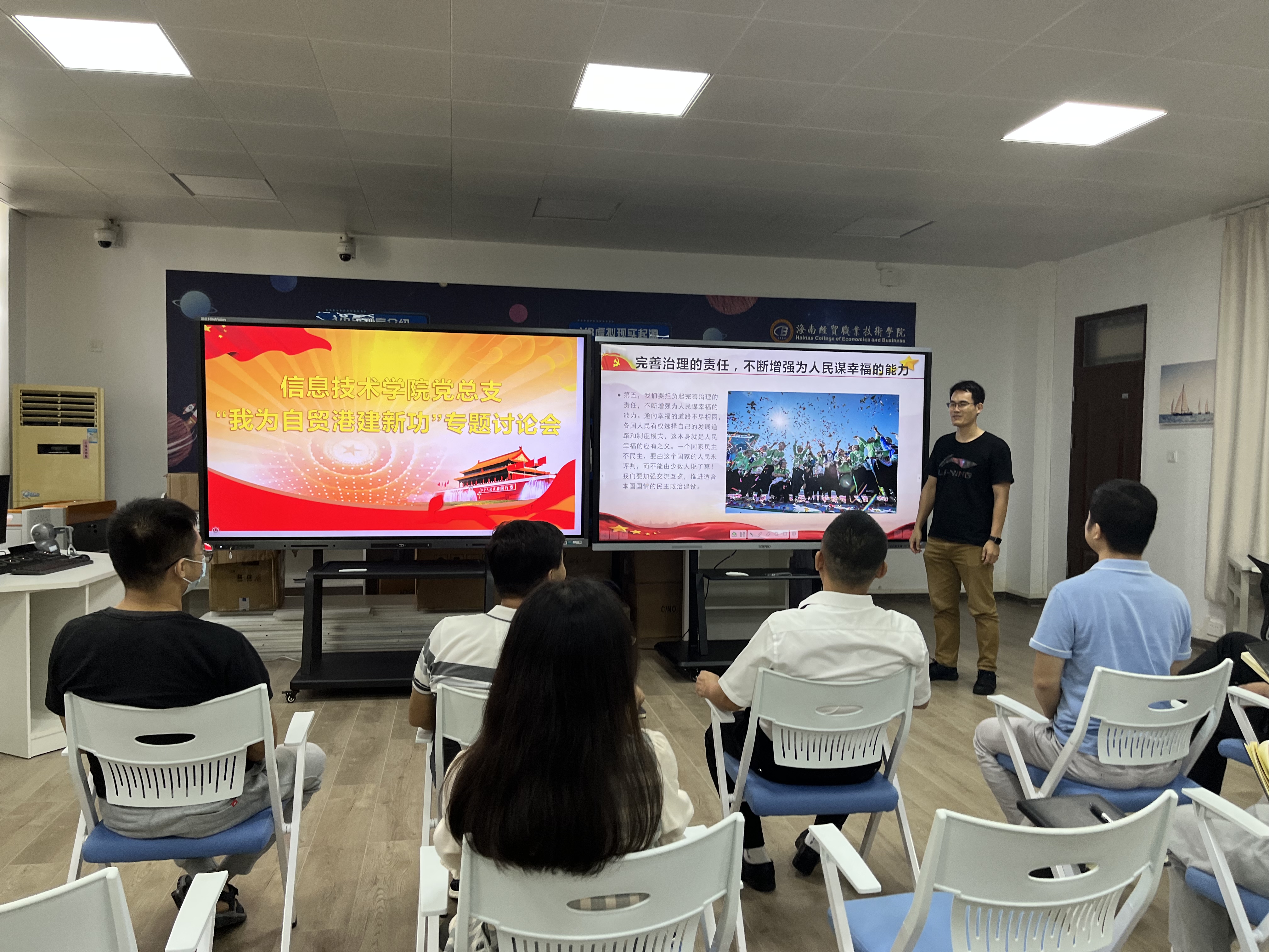 5月16日,太阳网集团tcy8722党总支在4-401召开“我为自贸港建新功”讨论会,会议由党总支书记符胜主持,太阳网集团tcy8722全体教工党员参加了会议。