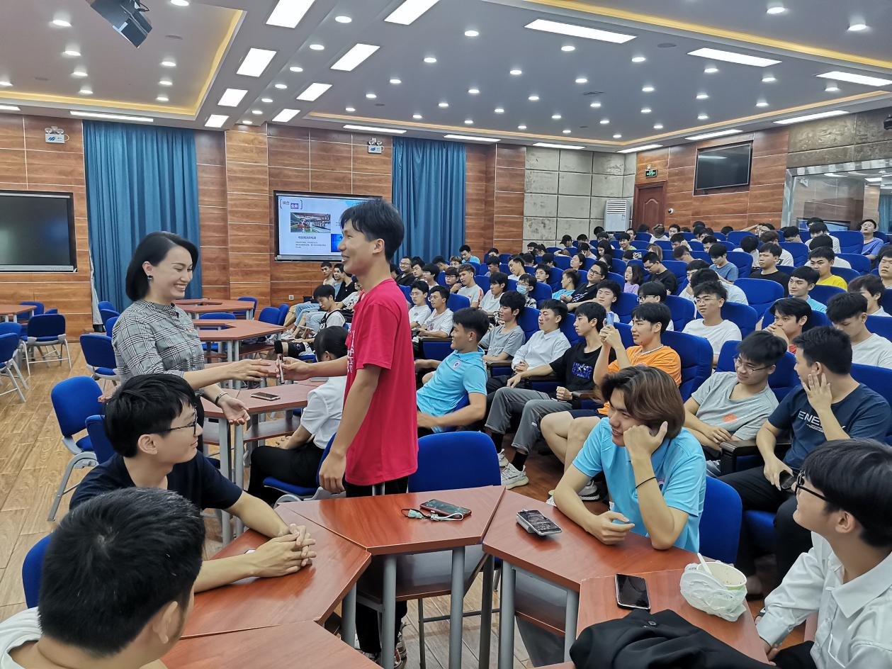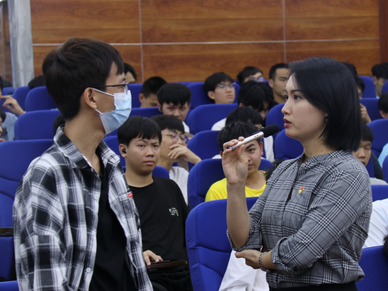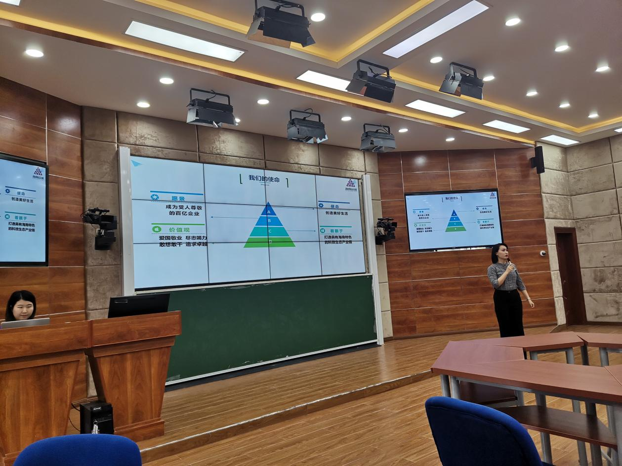 创始人陈兴莹以生动有趣的形式给同学们分享了她的企事业历程及公司的发展方向,希望同学们把专业知识学好,在校期间多参加各类活动,她鼓励同学们加入学生会组织,锻炼自己的综合能力,与时俱进,懂得思维变化,最终才能破茧成蝶。在现场,陈总与同学们进行了积极的互动,解答了同学们的困惑并明确在校期间的努力方向。