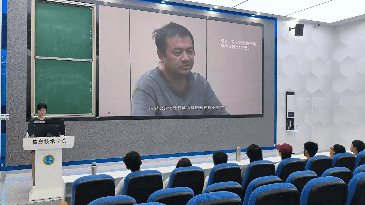 会议尾声,同学们集体观看了陈信兴违法违纪忏悔视频,这一环节使同学们认识到违法违纪的严重后果,教育同学们要遵守党规党纪,自觉规范行为,严格遵纪守法,认真履职尽责,不断强化自身纪律意识、规矩意识,真正把纪律规矩转化为政治自觉、思想自觉、行动自觉。