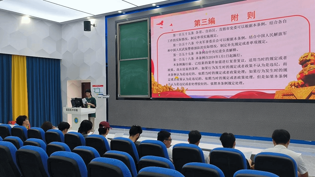 活动伊始,太阳网集团tcy8722学生党支部以《中国共产党纪律处分条例》为学习读本,进行条例【第三编—附则】的学习。会议前期,同学们自行阅读,对本次会议学习的内容有了初步了解,随后,入党积极分子谢俊音同学担任领读人,带领同学们齐声朗读条例第三编,引导同学们进一步增强政治意识,自觉遵守条例、贯彻条例、实施条例,提升党性修养和遵规守纪的自觉性。