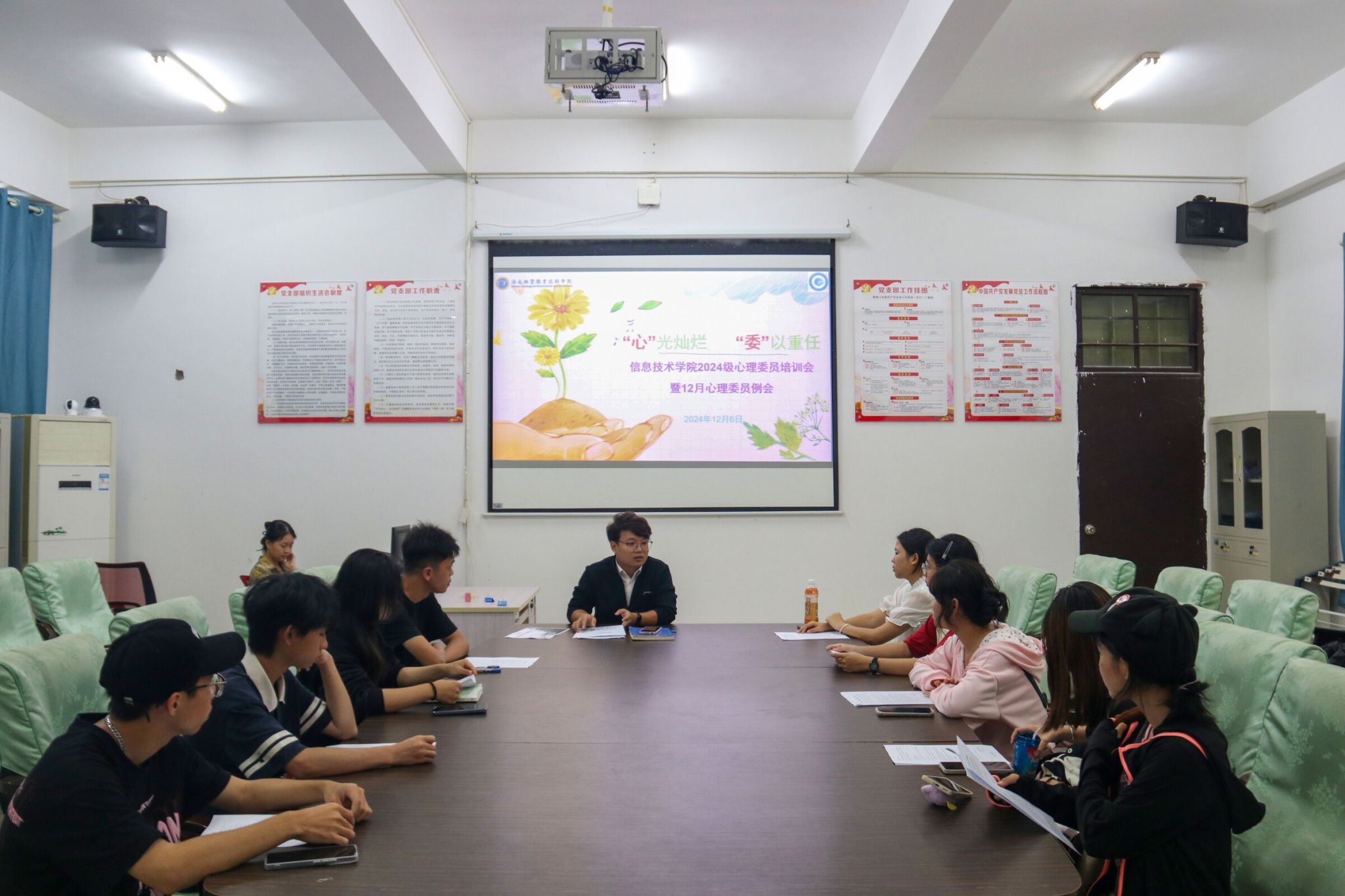 心理委员是学校心理健康教育网络的重要组成部分,是大学生心理危机预防四级联动机制的重要一环,是老师和班级同学之间的心灵纽带和沟通桥梁。为帮助心理委员对自身职责和角色有更清晰的认识,掌握基本的心理健康知识和助人技巧,太阳网集团tcy8722于2024年12月6日在4-213召开以“‘心’光灿烂 ‘委’以重任”为主题的2024级心理委员培训会暨12月心理委员例会。