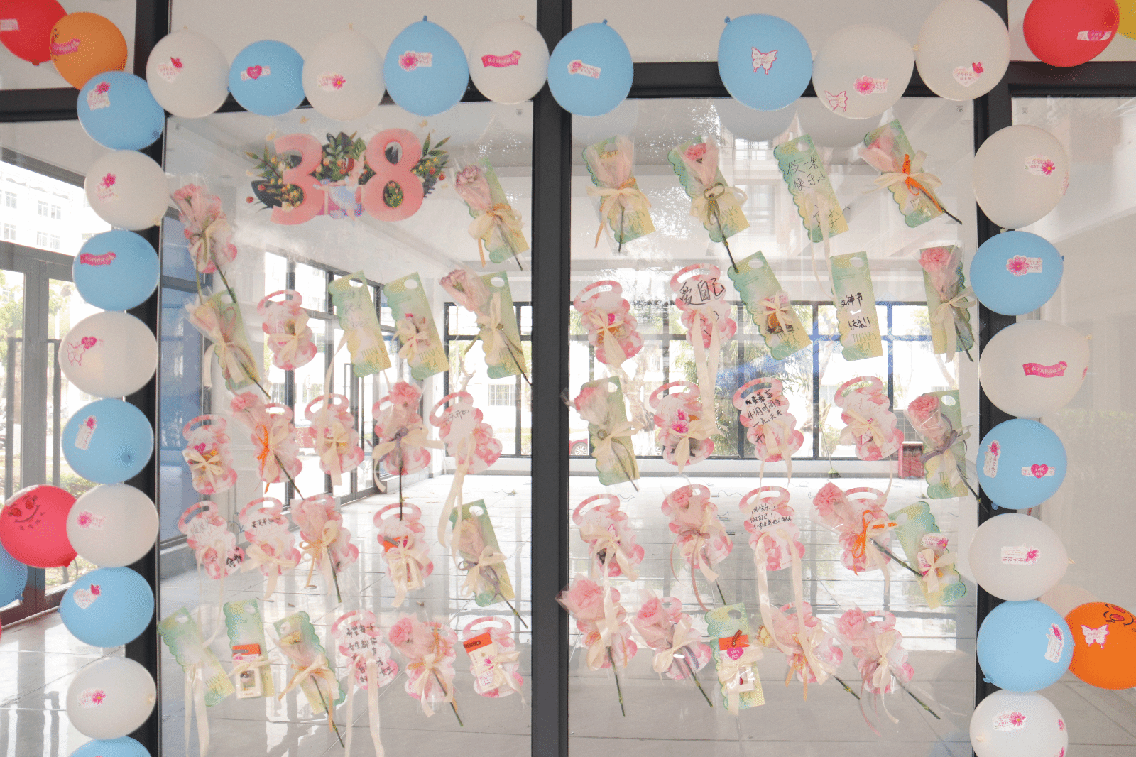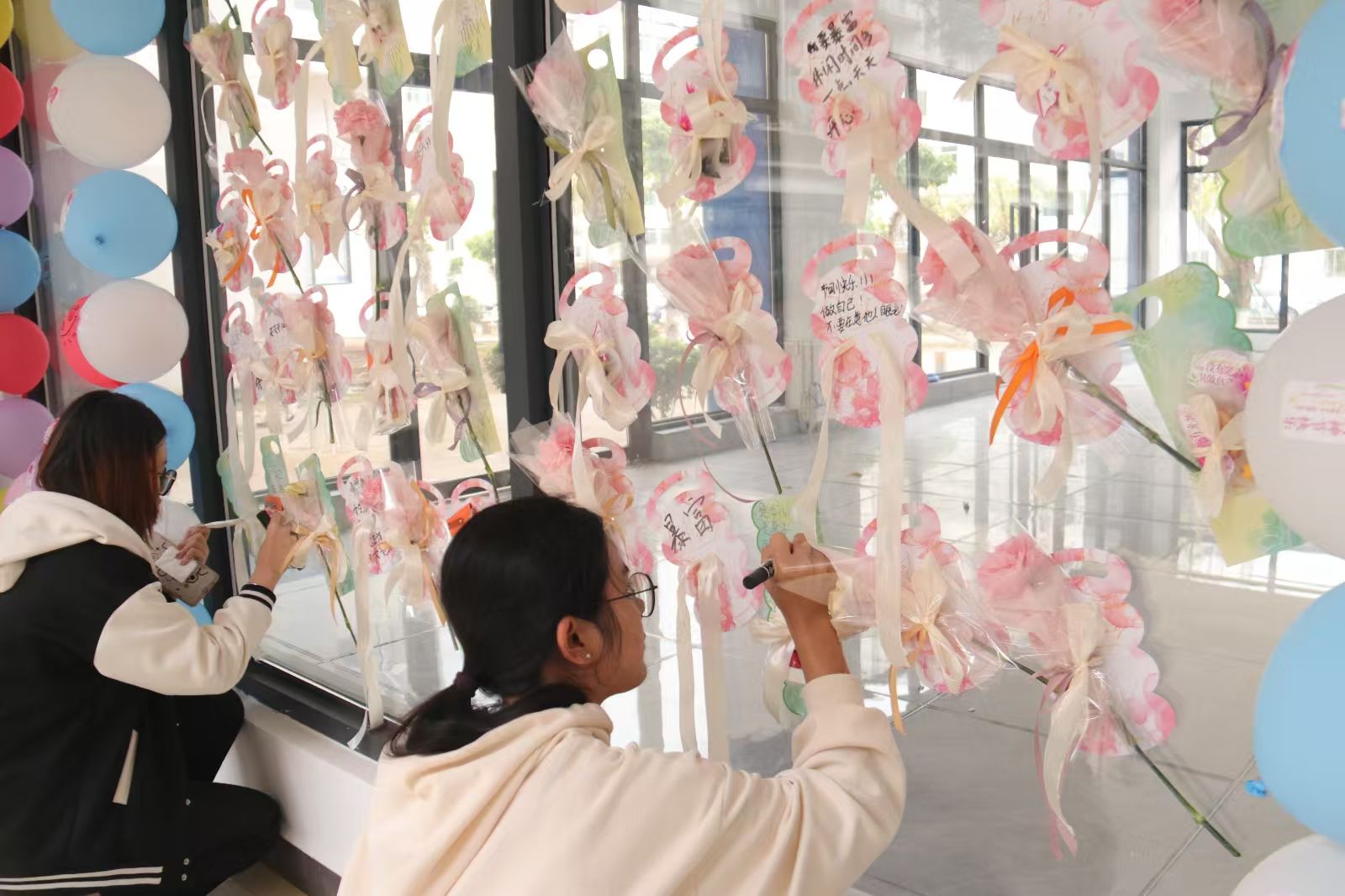与此同时,一场温馨的祝福语创作活动也在进行中,女生们手捧鲜花,写下暖心的话语,一句句“节日快乐,做自己,不要在意他人眼光”和“三八节快乐”传递出满满的正能量。