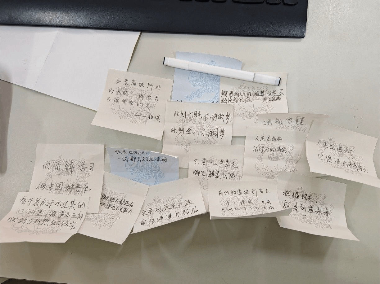 把心事寄出去——“加油过四级!”“向雷锋学习,做中国好青年!”一张张便利贴上,密密麻麻地写满了同学们的小烦恼和大梦想。文字仿佛拥有魔法,轻轻一挥,就把烦恼统统锁住,只留下好心情在心中欢快起舞。