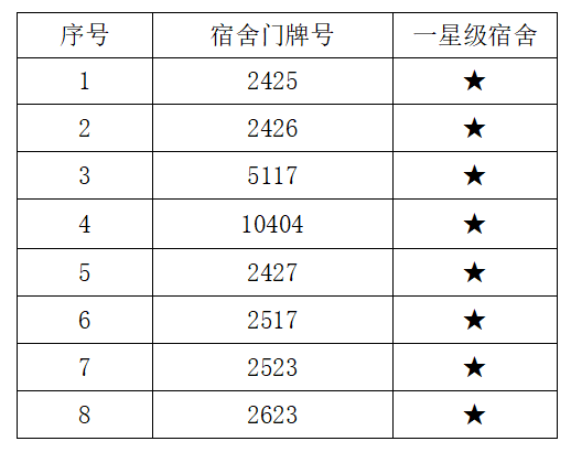 本次查评比的重点主要针对宿舍卫生、宿舍文化、安全纪律、文明行为等四个方面进行打分,并综合前三次查寝记录分数,以《海南经贸职业技术学院“星级文明宿舍”评比方案》为指导,综合评比,共评选出8间“一星级宿舍”,具体名单如下: