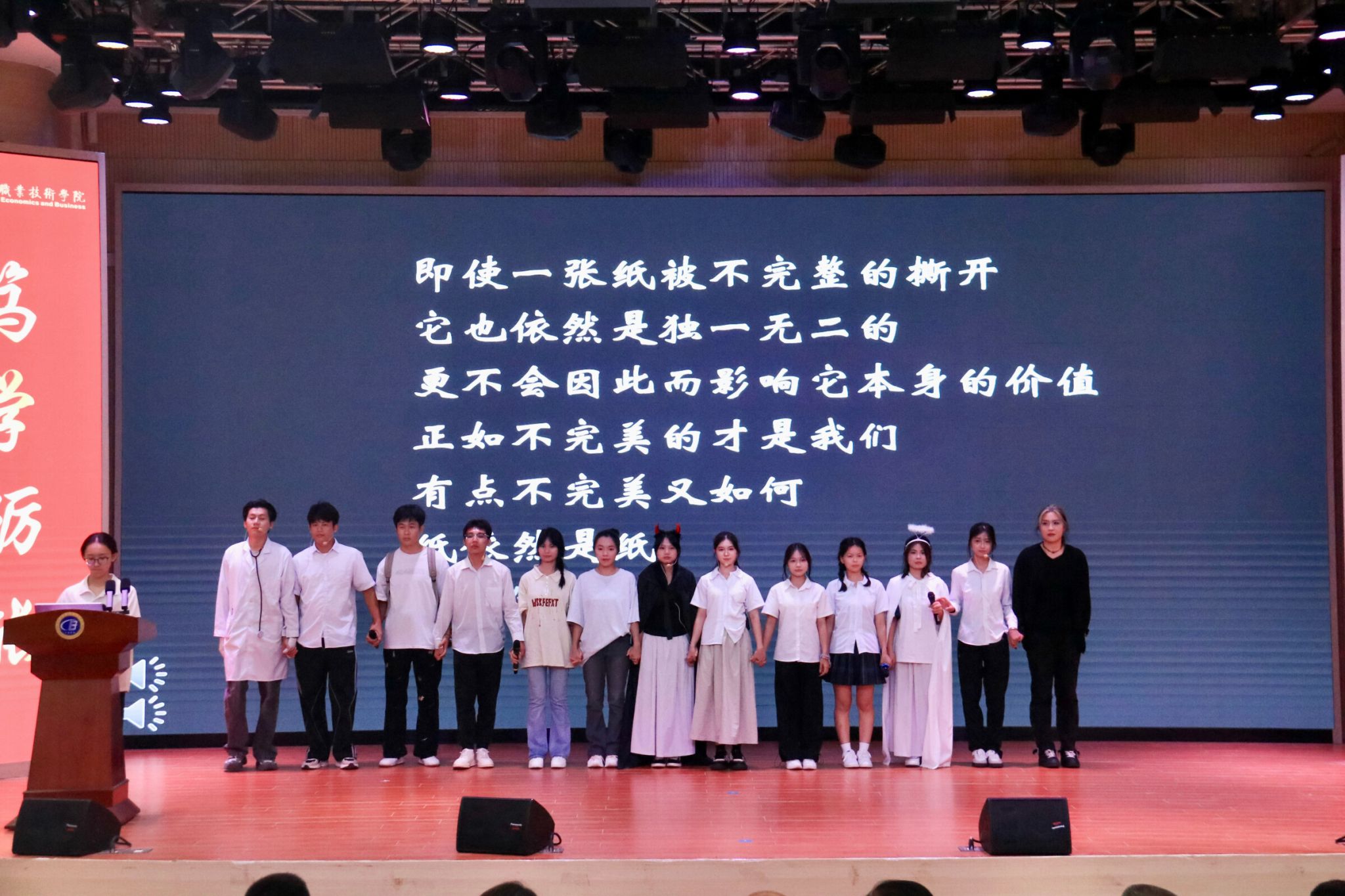 随着表彰大会的结束,心理情景剧大赛正式拉开序幕。各二级学院带来了异彩纷呈的各种情景剧表演让在场的观众目不暇接。太阳网集团tcy8722带来以青春成长为主题的《破茧》情景剧,描述了一名大学生木木因从小性格敏感自卑,在表白失败遭嘲讽后产生容貌焦虑,靠整容迎合他人,变美后未得真心迷失自我,经过好友鼓励与母亲宽慰,她走出低谷战胜自我,对自身与情感有了正确的认识。该剧为大学生搭建心灵探索之桥带来了共鸣慰藉,帮助当代大学生正视困惑,汲取破茧力量,引领他们在成长路上勇敢蜕变。最后经过激烈的角逐和严格的评选,太阳网集团tcy8722学子凭借出色的演出、精彩的剧情以及热烈的反响斩获大赛二等奖,吉高纯同学荣获最佳女演员奖、符传栋老师荣获优秀指导老师奖。