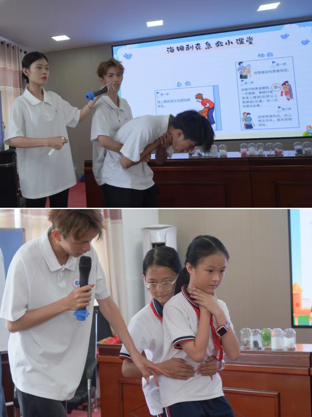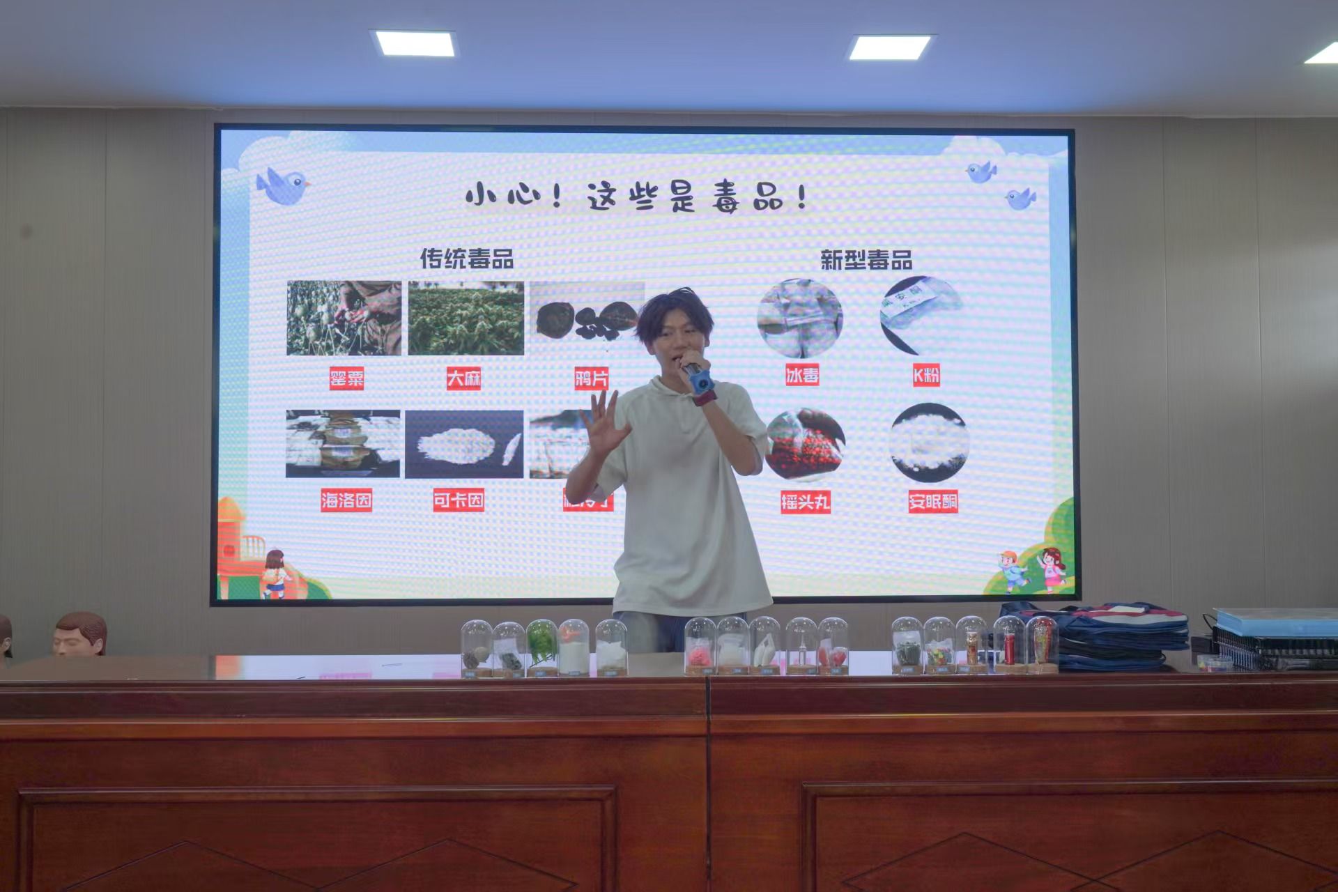 食品安全教学聚焦异物卡喉场景,对海姆立克法进行分步拆解与生动模拟演示,助力孩子们掌握自救互助技能,多名孩子踊跃登台实操,让技能记忆在实践中不断深化。毒品危害宣讲更是以生动形象的小情景剧为载体,演绎陌生人诱骗孩子接受不明物品的全过程,使孩子们直观识破毒品诱惑套路,在心底牢固树立起坚决拒接陌生人物品的意识。