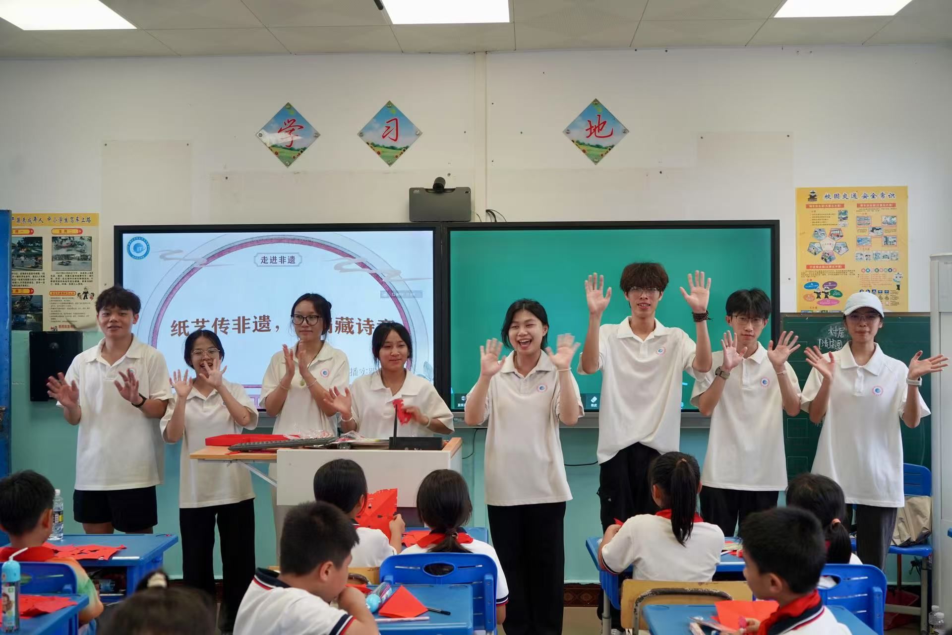 在 “剪纸的奇幻空间” 体验中,实践队围绕红纸和宣纸展开教学。他们先讲解了红纸的文化属性,从春节时的窗花到婚庆中的装饰,传递出其中蕴含的吉祥寓意;接着介绍了宣纸的工艺优势,并分享了绘图技巧。在进行安全提示后,实践队成员示范了对折法等剪纸技法,孩子们纷纷动手创作。他们剪出的图案有的质朴自然,有的精巧细致,在裁纸的过程中,孩子们深刻领悟到传统技艺中 “慢工出细活” 的匠心精神。