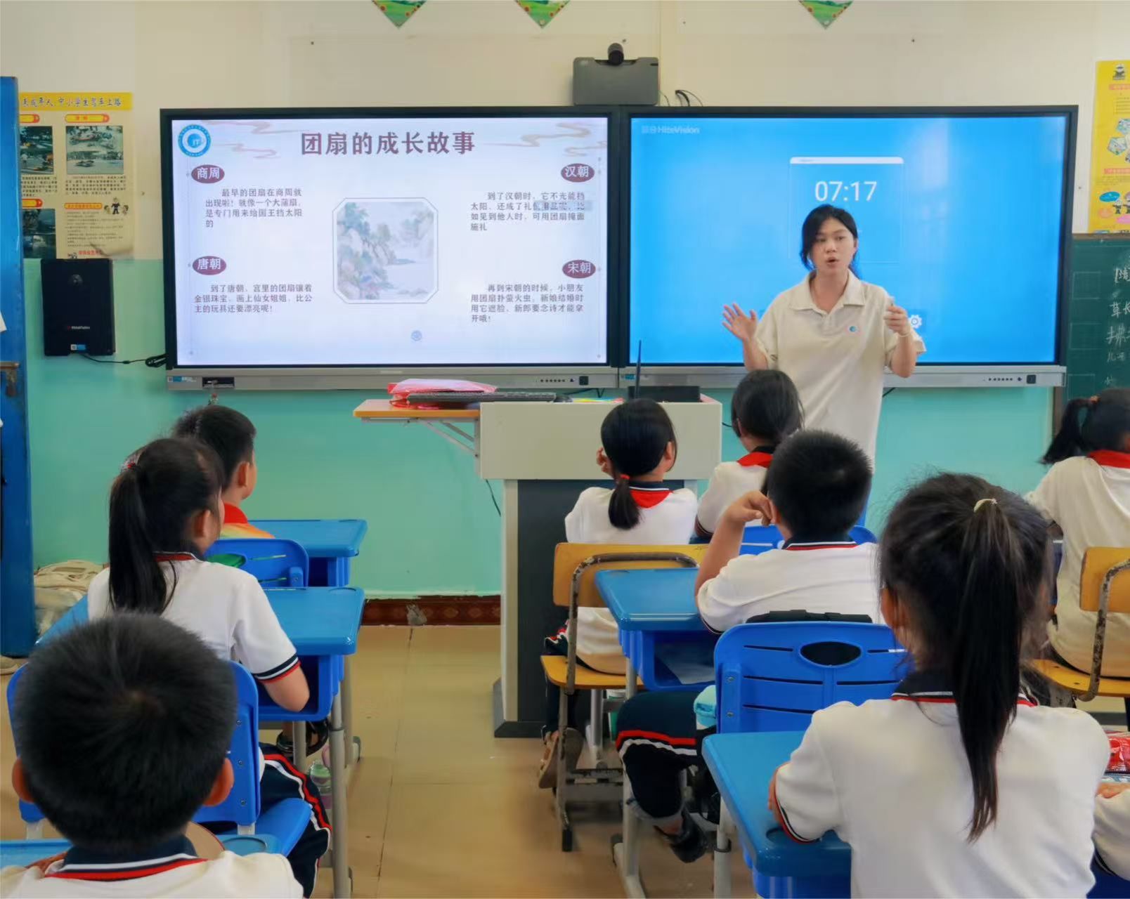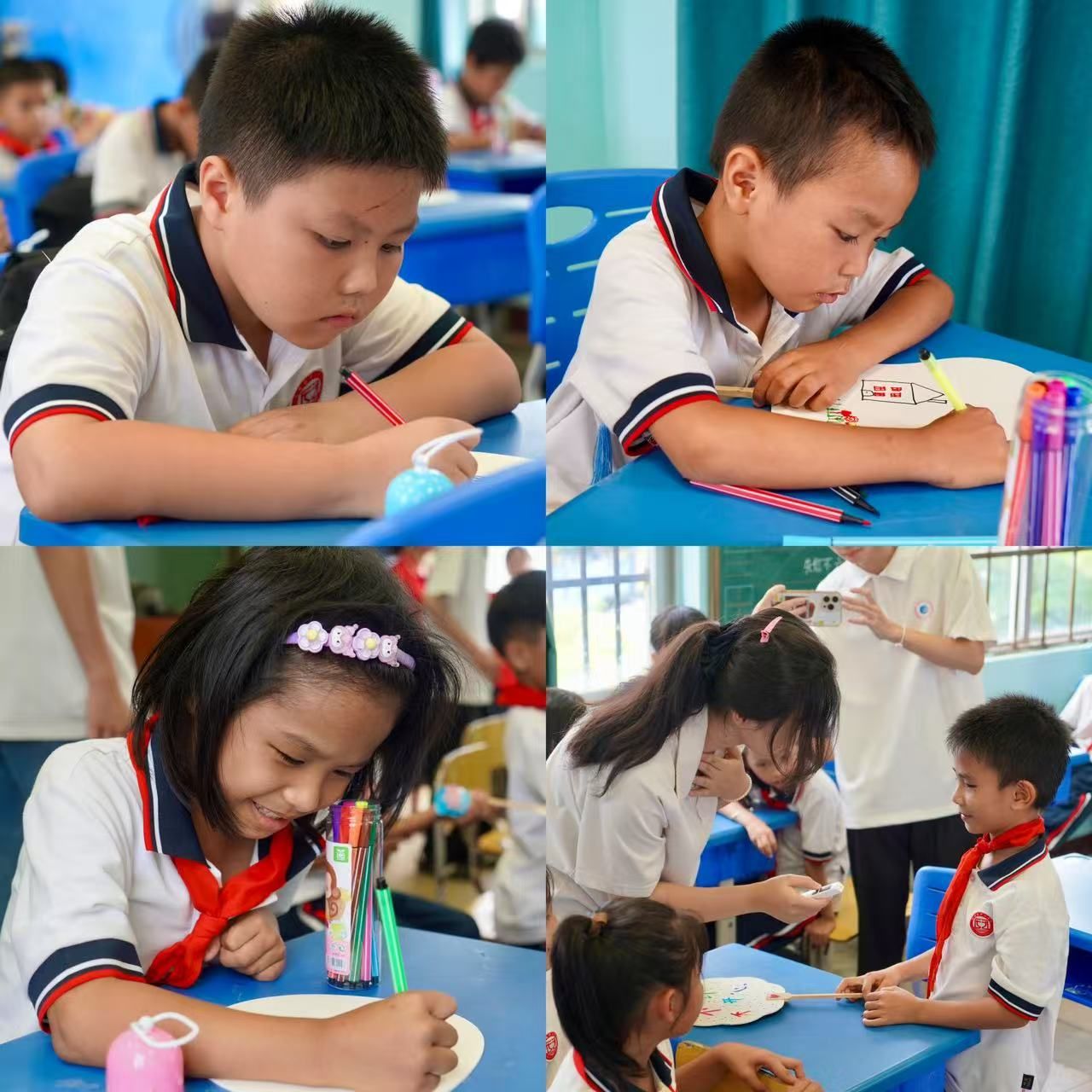 在 “团扇的魔法世界” 环节中,实践队成员首先为孩子们讲解团扇的历史。从古代的宫廷雅物到如今的民俗文化符号,让孩子们深切感受到团扇所蕴含的深厚文化底蕴。随后进入创作环节,空白的扇面和彩笔准备就绪,孩子们化身为 “小画家”。他们有的在扇面上描绘出山水意境,有的写下励志的文字,还有的创作了可爱的卡通形象。在创作过程中,实践队成员耐心指导绘画技巧,并与孩子们交流创意想法。一把把团扇成为了传统文化与童真创意完美融合的 “艺术品”。