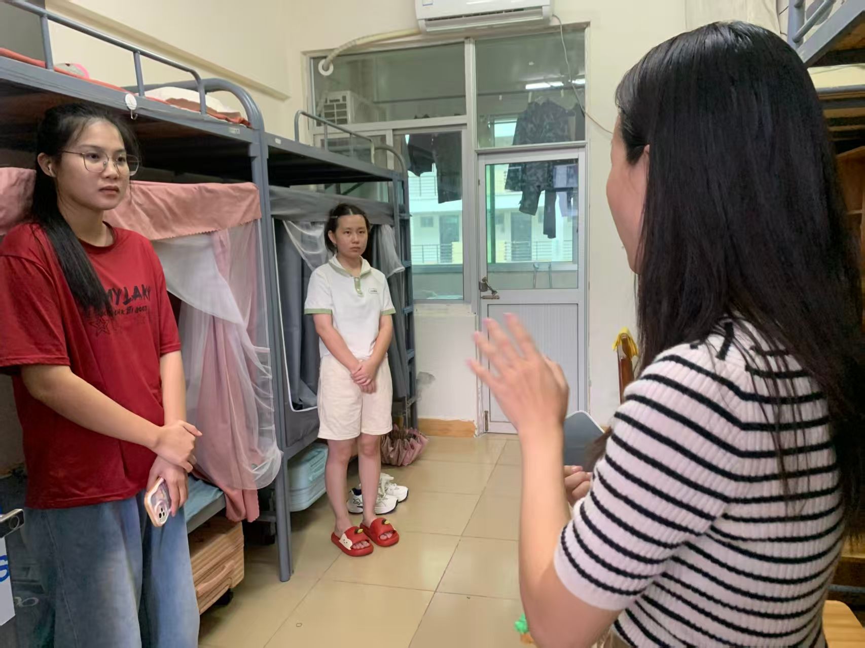 走访队伍逐间走进新生寝室,黄守官副书记、王智娴老师细致询问同学们的住宿情况,耐心解答学业、生活等方面的疑问。“宿舍生活还习惯吗?”“有没有需要学院协助解决的困难?”一句句关切的问候,迅速拉近了师生距离。黄守官副书记着重强调安全意识的重要性,提醒同学们警惕网络诈骗,妥善保护个人信息,严防信息泄露;王智娴老师则叮嘱新生外出尽量结伴而行,并严格遵守返校时间。