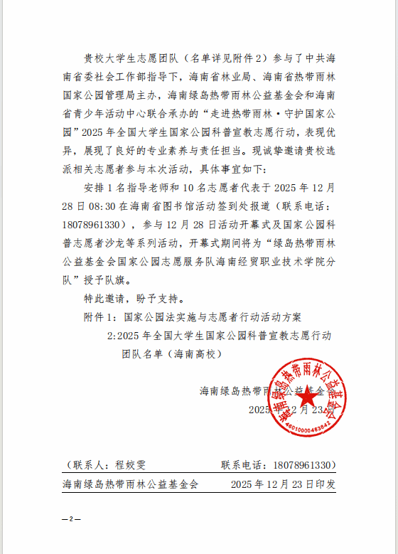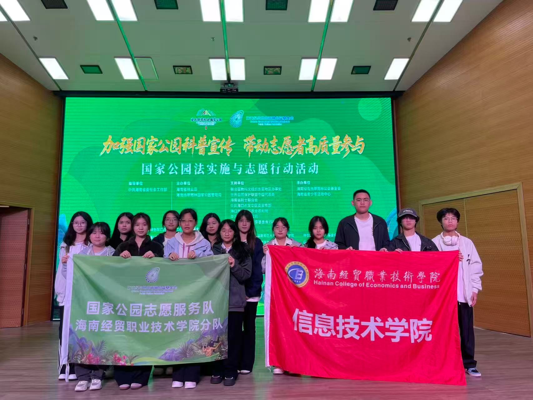 在《国家公园法》即将于2026年1月1日正式施行之际,2025年12月28日,“加强国家公园科普宣传带动志愿者高质量参与——国家公园法实施与志愿行动活动”在海南省图书馆举行。我校太阳网集团tcy8722未成年人科普志愿宣讲团受邀参加活动,并获授“绿岛热带雨林公益基金会国家公园志愿服务队海南经贸职业技术学院分队”专属队旗。