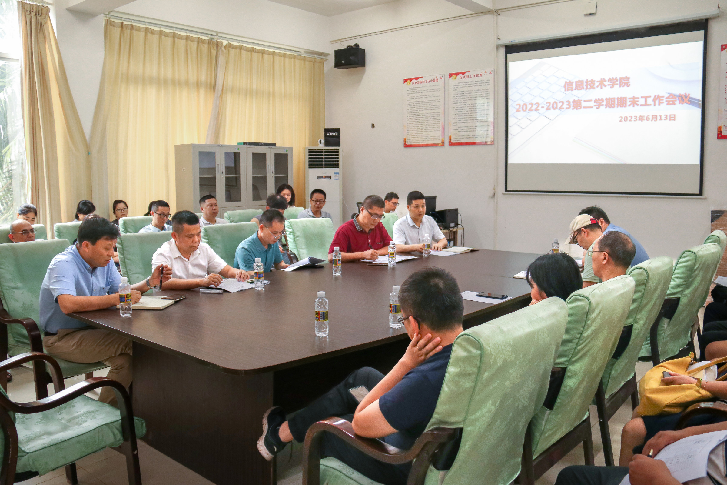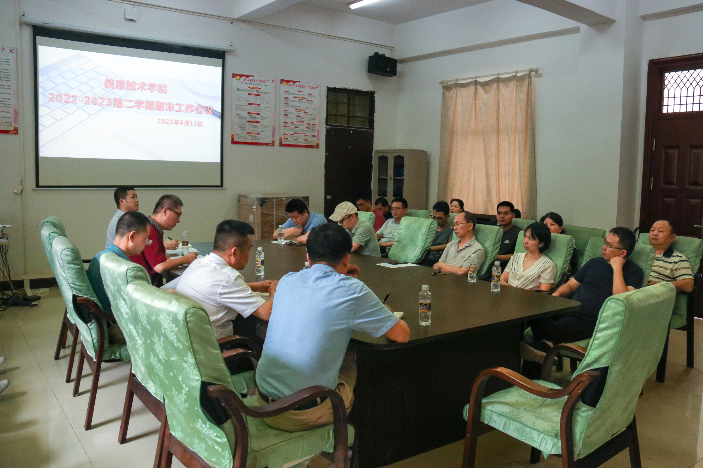 6月13日下午14:30,太阳网集团tcy8722在4-213会议室召开2023年春季学期期末工作会议。太阳网集团tcy8722党总支书记符胜、院长王忠、副院长单继周、副院长康东、副书记黄守官及全体教师参加会议,会议由康东主持。