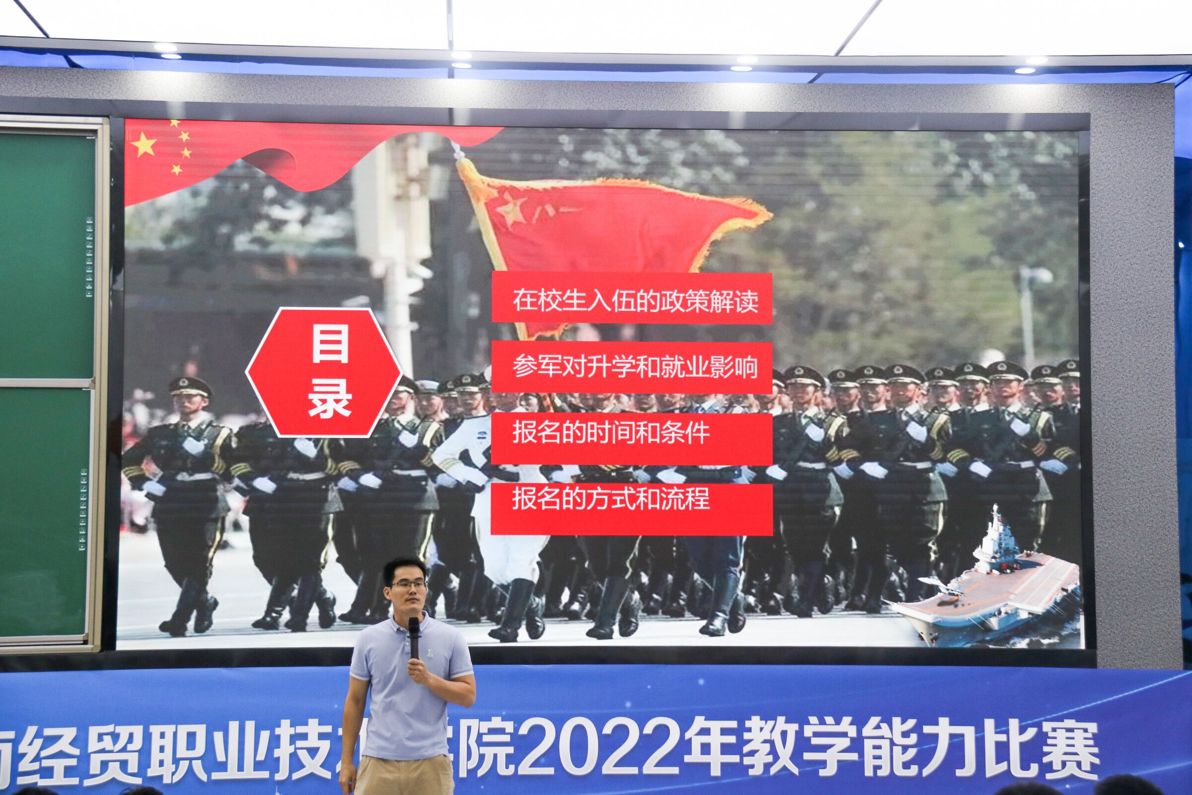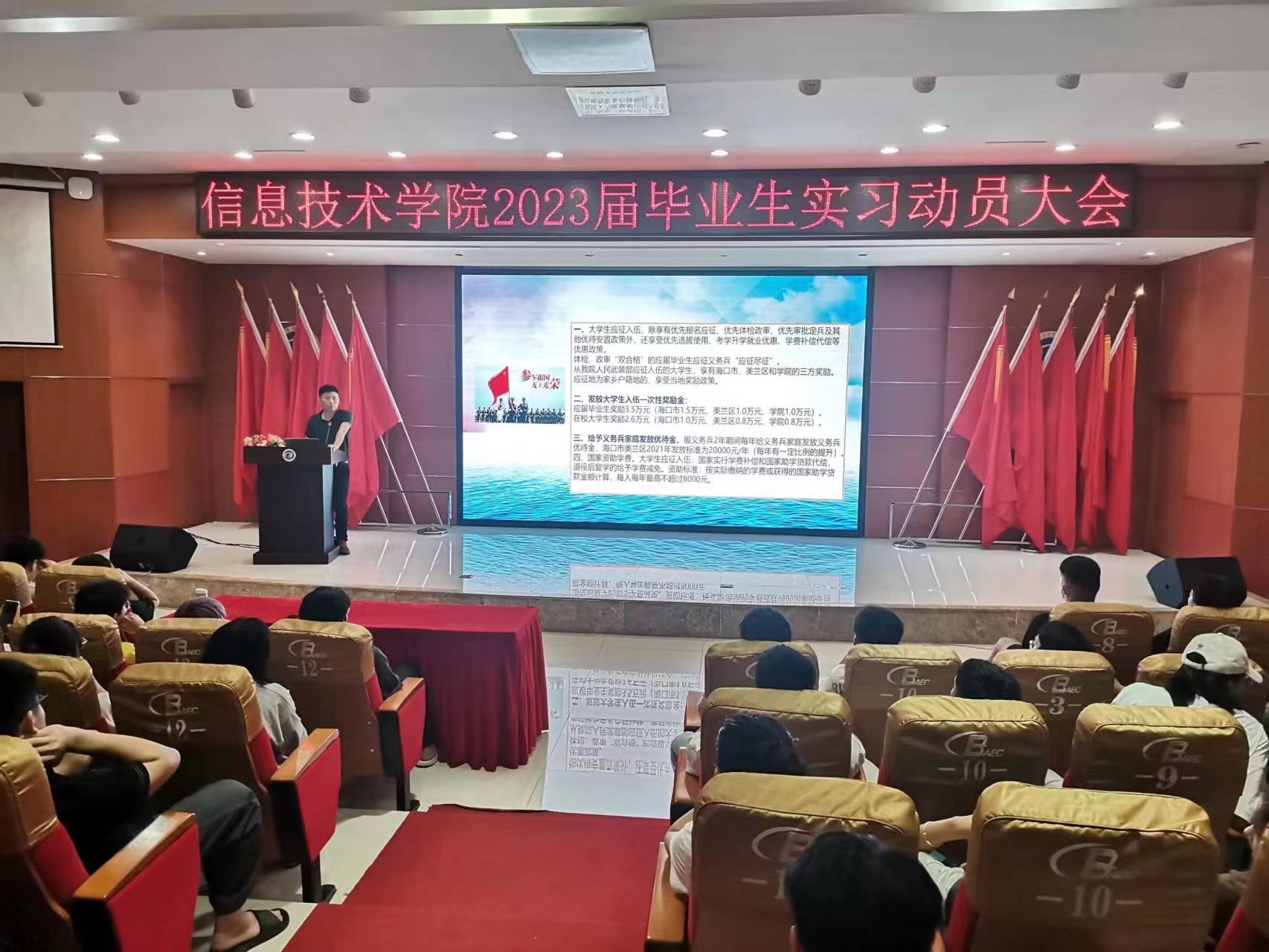 宣讲伊始,唐图老师给同学们观看2022年征兵宣传片,让信息学子热切感受到人民子弟兵对祖国的热爱、对社会的责任、对人民的守护。紧接着,唐图老师向全体同学详细解读了在校生入伍的优惠政策,大学生参军入伍不仅可以积攒一份与众不同的人生阅历,锤炼一种军人钢铁般的意志,还能积累到一份无形的精神财富,享受到政府赋予的各种优惠福利政策。