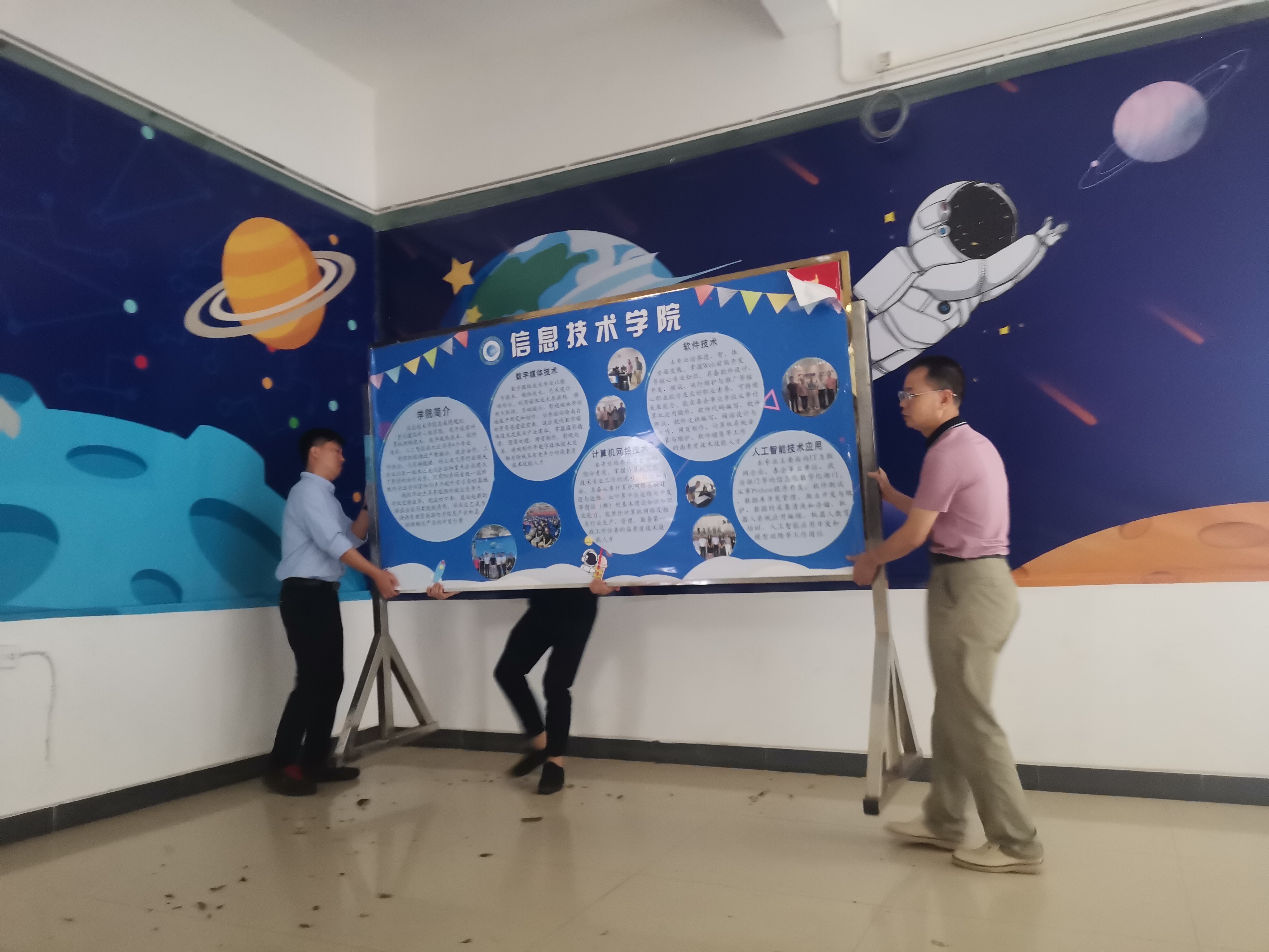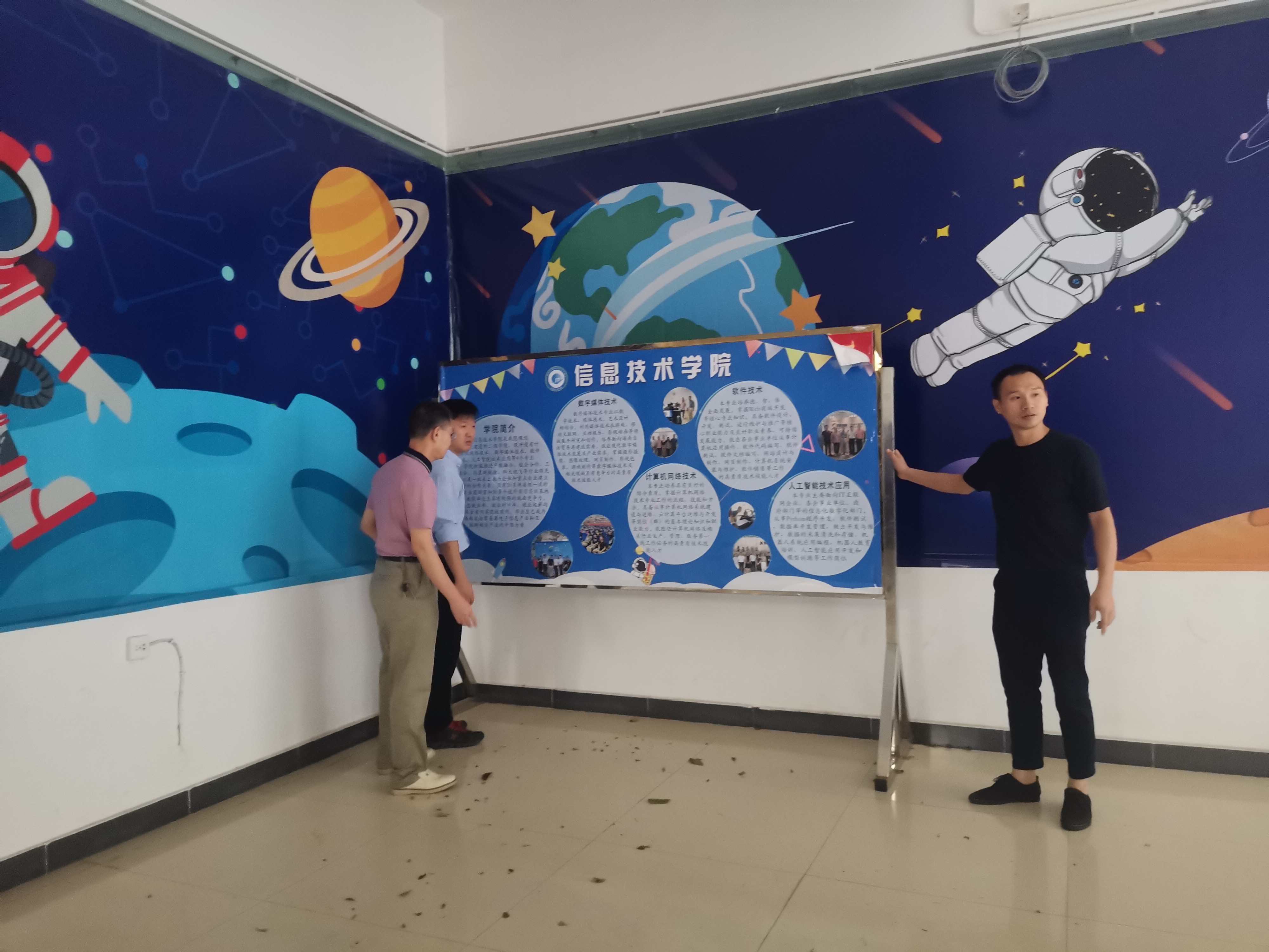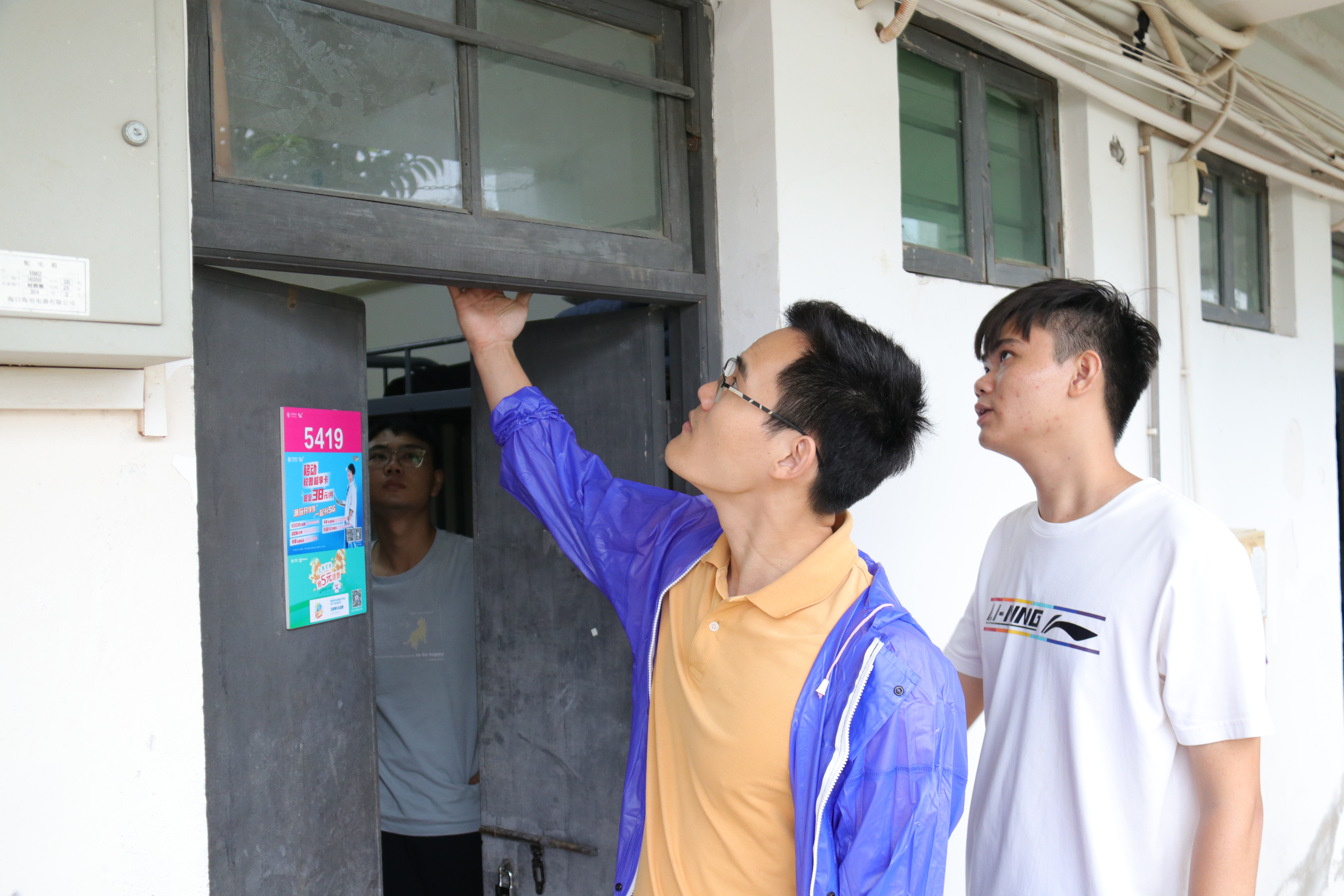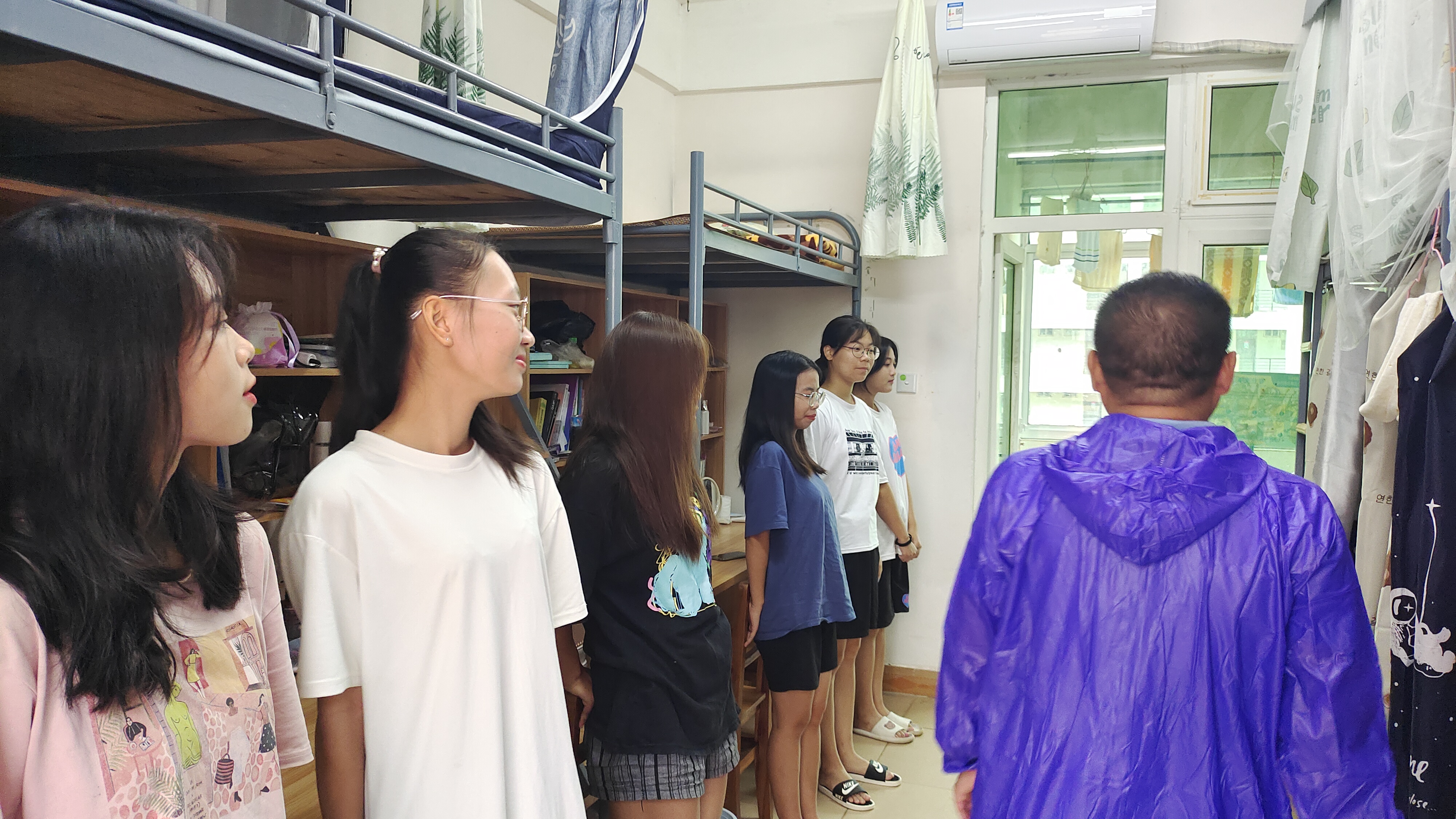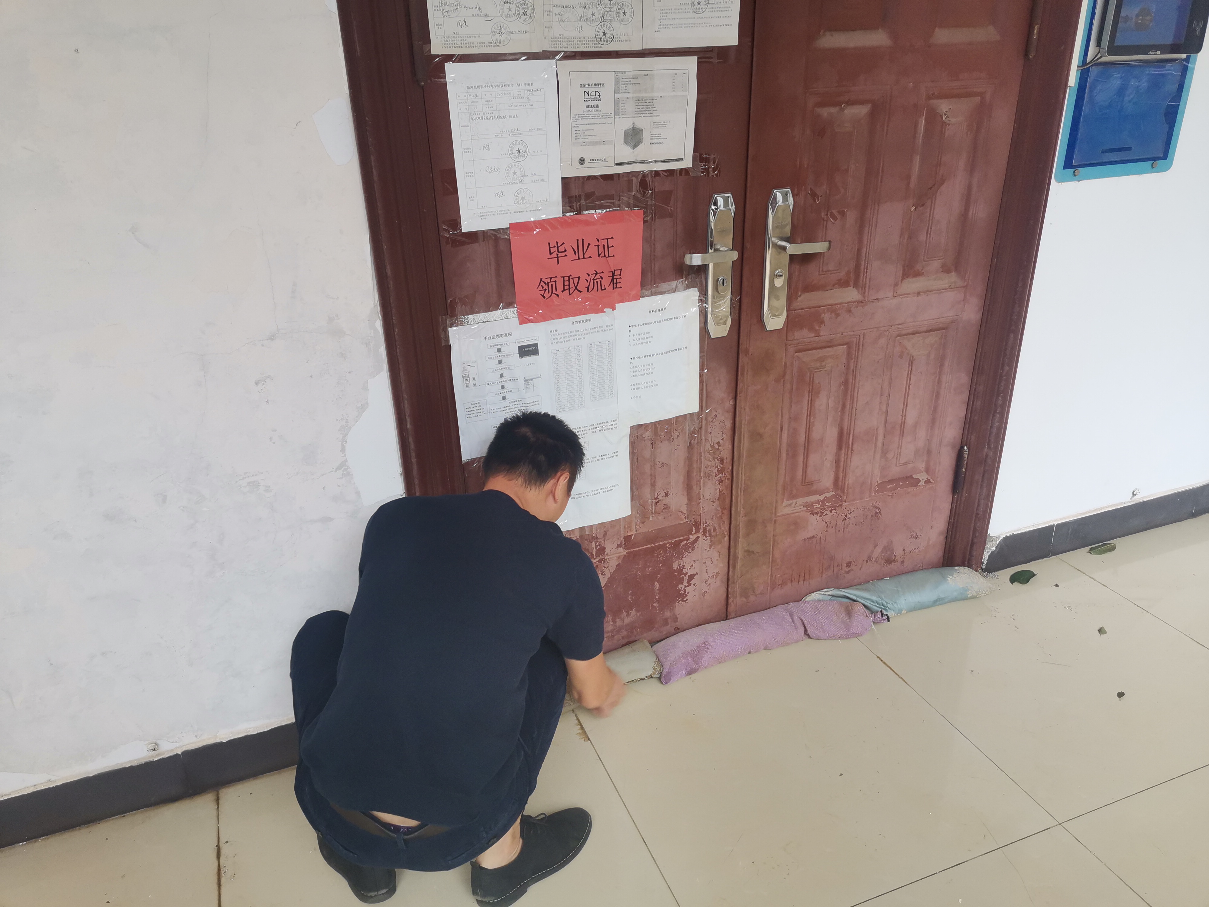 工作小组的每员成员在走访过程中一一提醒同学们提前屯粮、屯水,叮嘱每位学生都要注意预防风雨侵袭,关好宿舍门窗,保护自身安全,并对宿舍内部门窗、公共区域进行安全隐患排查。同时身处院办留守的老师也开始做好台风防御工作,包括公告栏易倒设备转移至安全地区、易涝教室堆叠沙袋防护等。