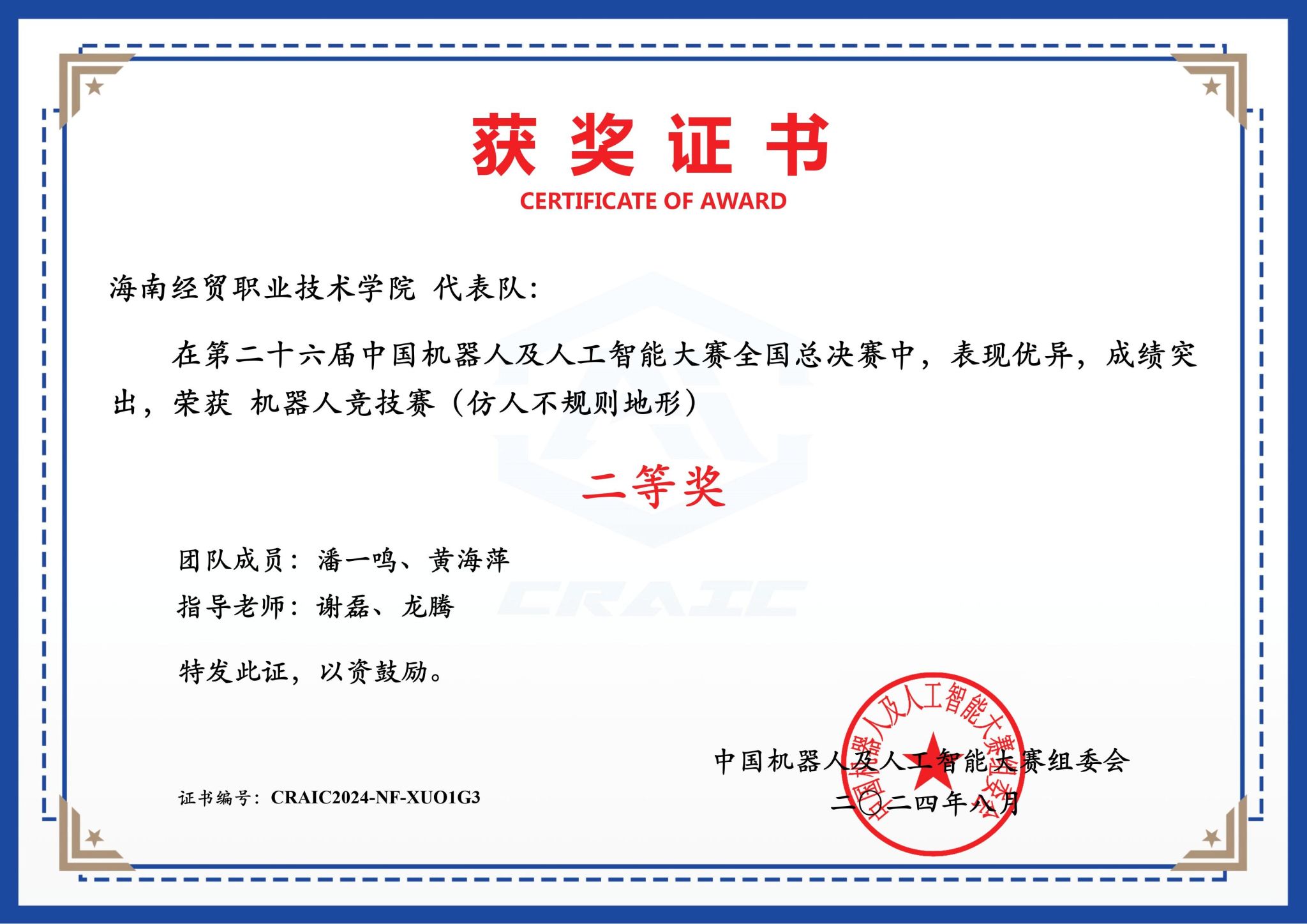 8月25日,第二十六届中国机器人及人工智能大赛全国总决赛顺利结束。海南经贸职业技术学院太阳网集团tcy8722夏聃清、潘一鸣、方顺同学荣获“智能文化创意创新赛国赛一等奖”(指导教师:王忠、张良峰),潘一鸣、黄海萍同学荣获“机器人竞技赛国赛二等奖”(指导教师:谢磊,龙腾)。