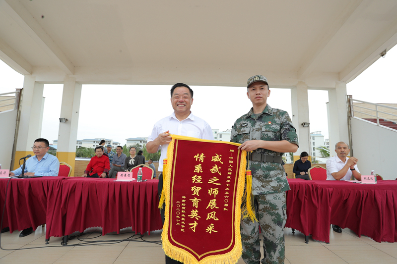 黄景贵院长代表学校向承训部队赠送“威武之师展风采、情系经贸育英才”锦旗,感谢教官们给予学校新生的军训帮扶,并为17位教官颁发“优秀教官”奖。