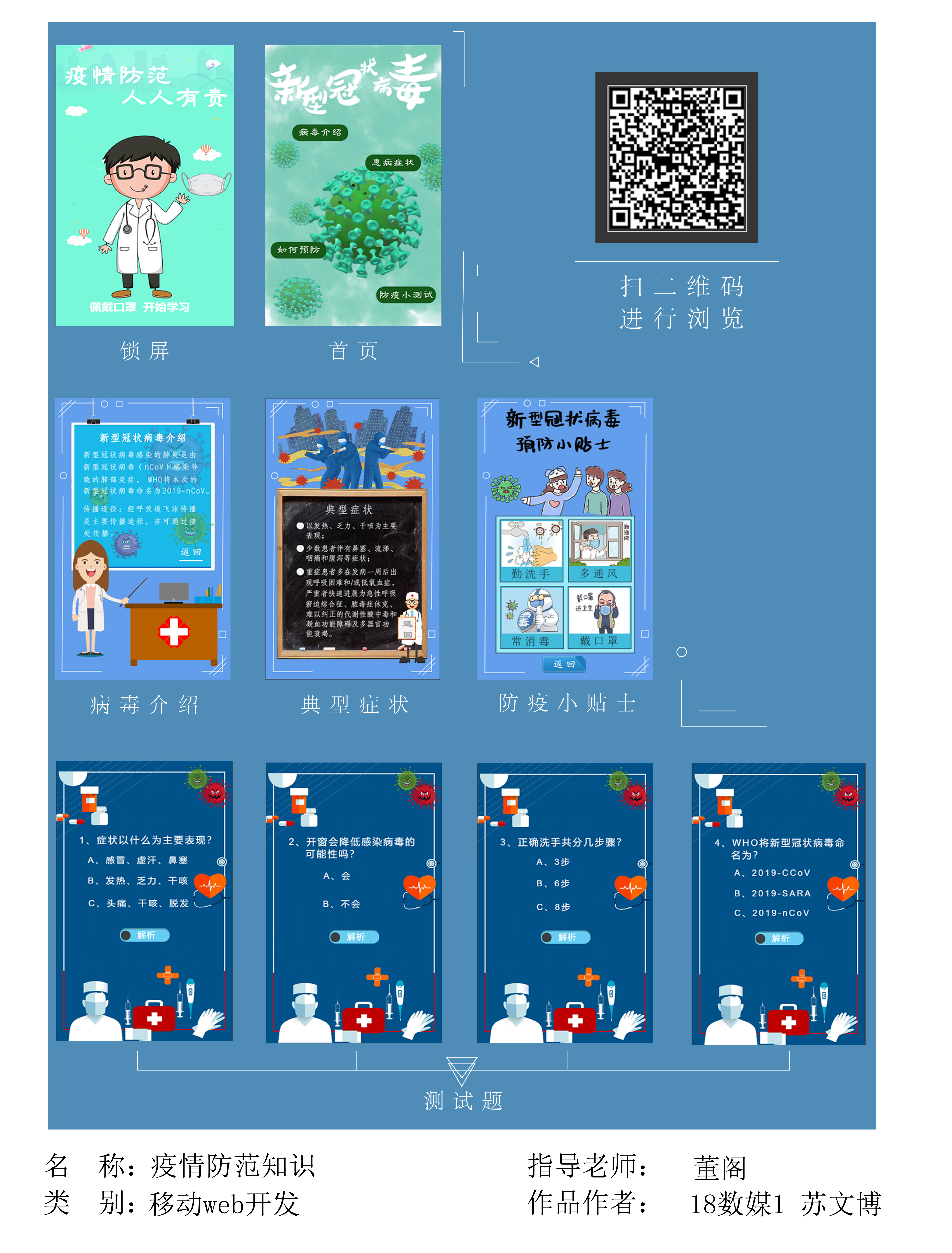 2018级数字媒体专业的同学充满自信,向老师同学们展示自己的作品。他们通过自己的作品展现与感慨大学的乐趣、收获与遗憾。比如《疫情防范知识》作品以手机H5形式呈现,生动有趣的交互,形式多样的页面,普及新冠肺炎的防范知识。三维动画微课毕业作品《竹石》以小女孩小蕾因为练习舞蹈辛苦无法坚持,通过老师的耐心劝导与微课“竹石”的学习,从诗词《竹石》与了解作者“郑板桥”的事迹后,明白了面对困难坚持不懈,毫不退缩的精神态度。平面毕业作品《抗疫宣传手册》则以平面手册的形式宣传了目前防疫抗疫的知识方法,配以大量卡通图片让人一目了然,简单易懂。影视广告作品《可口可乐》通过情侣篇、生活篇、运动篇三个小广告来展现可口可乐的激情生活,剪辑流畅,构思新颖,活泼生动。本次毕业答辩比赛共计有48个作品参与角逐,形式多样,丰富多彩,赢得了老师同学们的喝彩和掌声。同学们还与观众们展开了积极互动,活动气氛十分活跃。