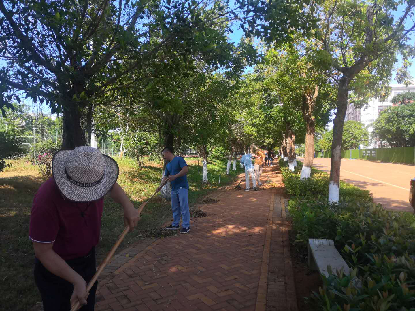 校园卫生主要清扫负责区域的白色垃圾、落叶、小碎石等,教室主要清洁地面、桌椅等,在36℃的高温天气下,老师们撸起袖子,有的清扫落叶,有的清理垃圾,有的打扫教室地面,有的整理教室桌椅,干得热火朝天、汗流浃背。清理过后,经贸北路干干净净,垃圾摆放整整齐齐。