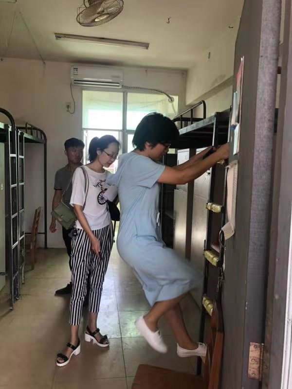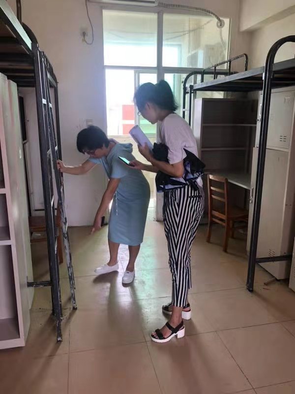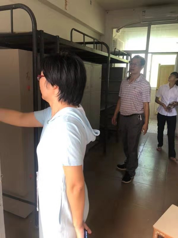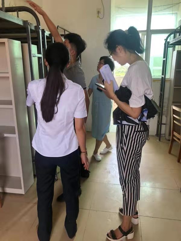 2019年8月30日(青年媒体中心报道)讯,学校新学年实施高等教育扩招政策,为给同学们更舒适便利的住宿环境,各学院配合学校进行了宿舍搬迁改造工作。8月30日下午,为了解学生宿舍的搬迁进展,以及排查学生宿舍的安全隐患工作,我院党总支书记陈继敏、党总支副书记陈亚芳、学工办主任梁其钰、18级辅导员代晓明与18级辅导员郭蓉佳等多位领导老师深入学生公寓进行走访。