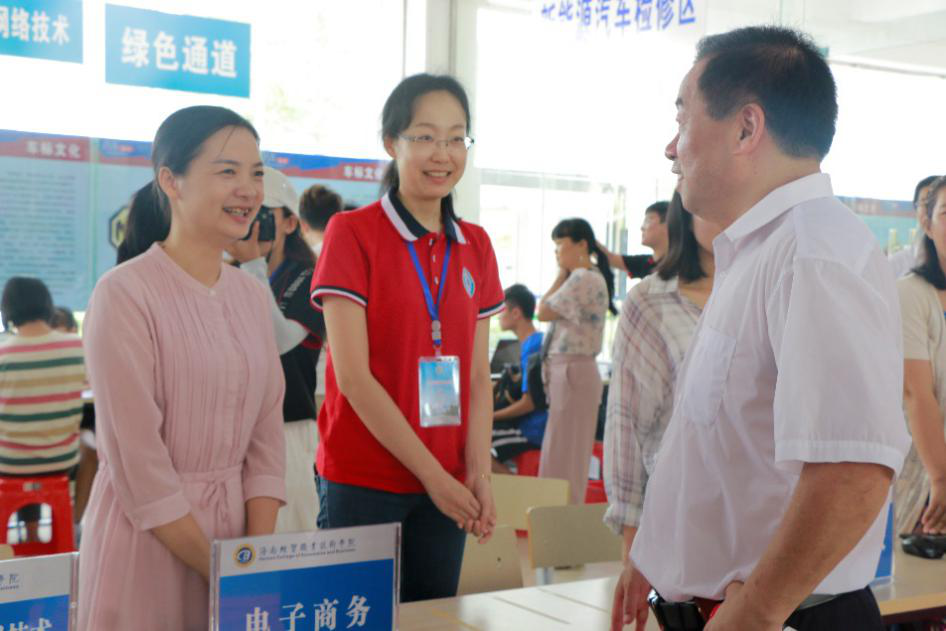 2019年9月15日(青年媒体中心报道)讯,八方来客,相约九月,载着父母加注的深深期盼,又一批新的面孔齐聚于海南经贸职业技术学院。我院于2019年9月14日迎来了新的大一同学,迎来了新的希望。在这新生报到的第一天,各校级领导来到我院第二实训楼迎新现场,视察迎新工作的开展情况,亲切看望前来报到的新生和家长;慰问参与迎新工作的的师生员工,并对我院有条不紊的迎新工作现场给予了高度评价。