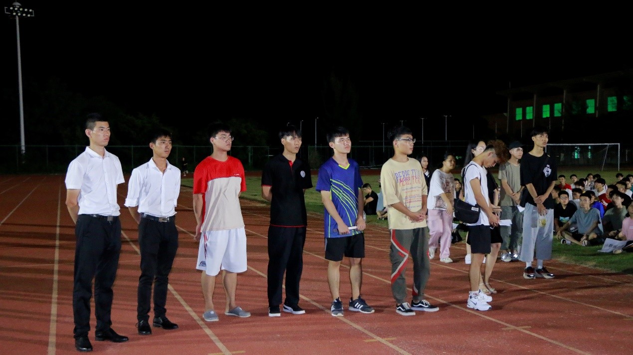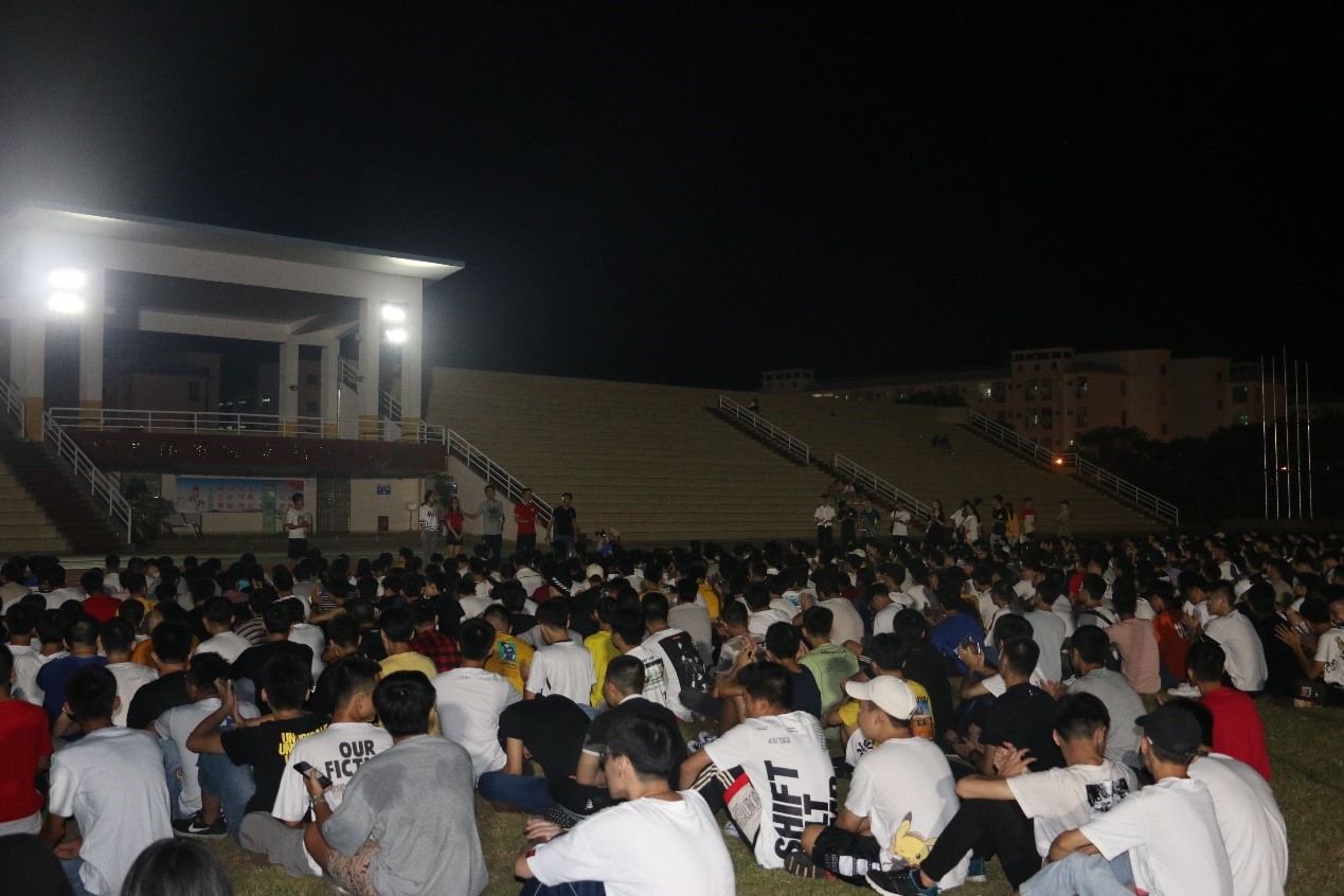 2019年9月15日(青年媒体中心报道)讯,忙碌的两天迎新工作已圆满结束,我院于9月15日晚19点半在田径场组织全体新生进行了第一次新生大会,参与本次大会的有:19级辅导员周恺老师,19级辅导员梁琪钰老师,19级辅导员唐图老师,18级辅导员郭蓉佳老师,18级辅导员代晓明老师,团学青部分成员,以及19级新生班级代班和所有19级新生。