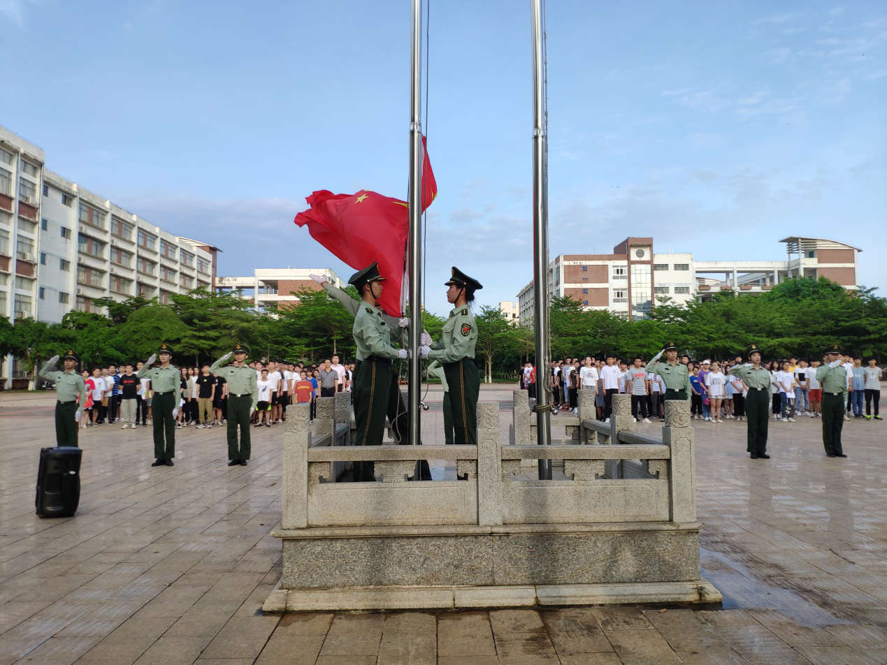 升旗仪式开始,全体肃静,国旗队伴着出旗的乐曲,高举着旗帜,迈着矫健的步伐走向主席台,鲜艳的五星红旗徐徐升起,迎风飘扬,全体唱国歌,行注目礼,庄严肃穆。