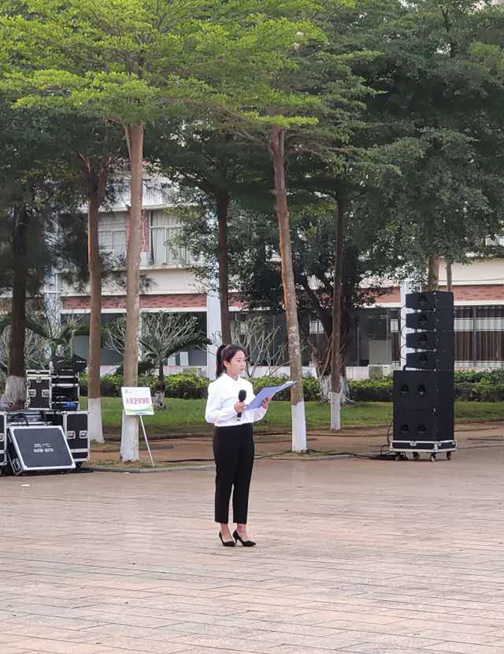 首先,在李雨馨同学的主持下,全体人员进行了庄严升国旗仪式。伴随这国歌声的落下,仪式接着进行了第二项,由学生代表郭华华做了国旗下演讲。作为学生代表发言的他用自己的亲身经历讲述了自己对于做一名幸福的高职生的理解,只有不懈的努力奋斗才能实现扩大自身的价值并走向幸福的未来,走向作为一名幸福高职生美好的未来。