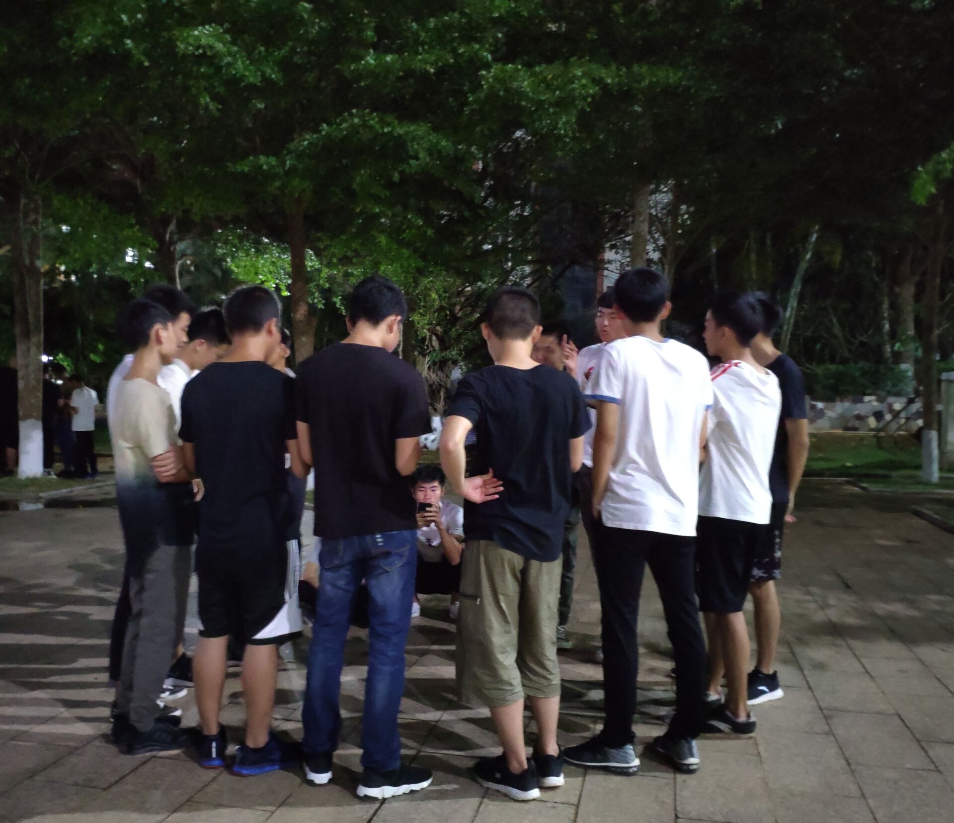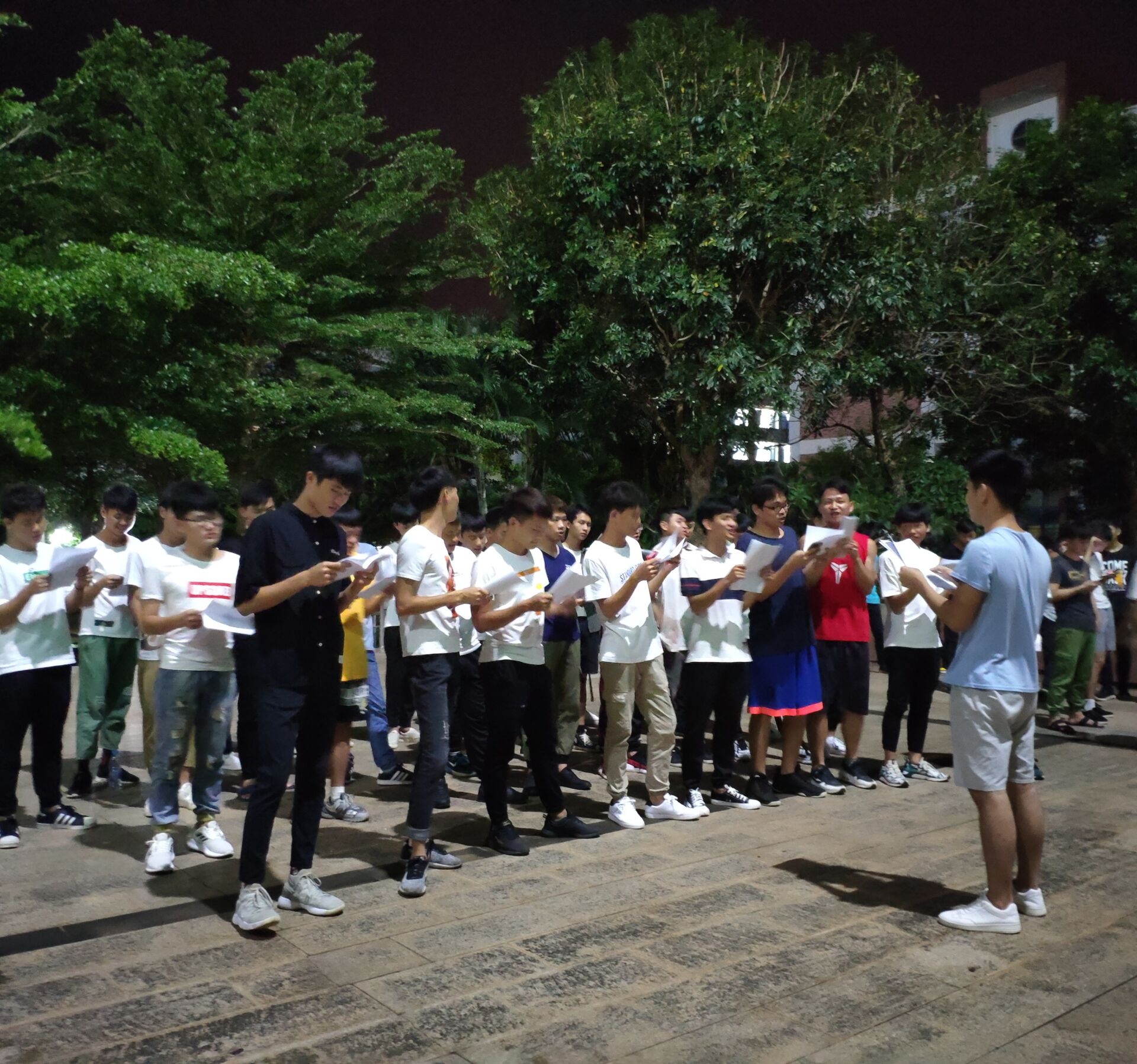 末尾,负责人周恺老师组织再一次集体大合唱,由于达不到预想效果,改变方案,男同学和女同学分开演练,直到傍晚9点20分结束。