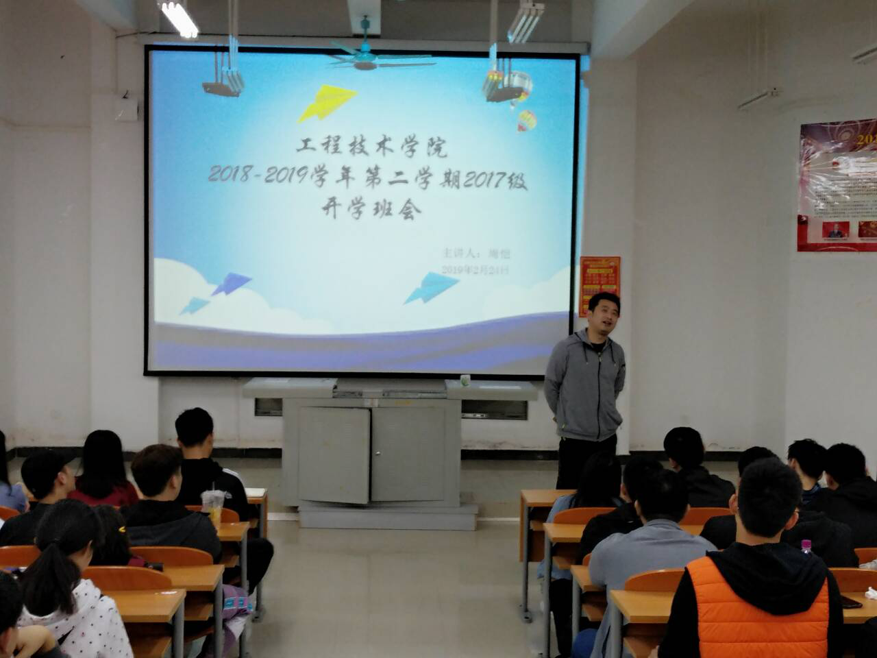 2019年2月24日(青年媒体中心报道)讯,为了同学们在新学期更好的学习和生活,我院定于2栋408召开了工程技术学院2018年至2019年第二学期的开学班会。到场人员有工程技术学院17级全体学生。此次会议由辅导员周恺老师主持召开会议。