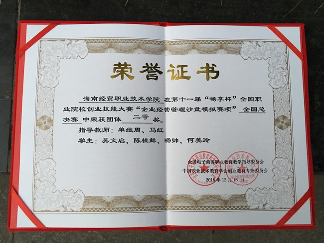 本次大赛采用国际先进的商业模拟训练模式,是集知识性、趣味性、对抗性于一体的企业管理技能竞赛,每四位参赛学生组成一个团队,每个团队获得两千万的启动资金以及同等的生产线、工人等资源,以一年为单个周期,连续经营6个年度,通过不同的资源投入配比,模拟生产型企业在实际经营管理中遇到的采购、生产、销售、融资、纳税等一系列状况,体验真实的市场竞争。由海南经贸职业技术学院工程技术学院学生吴文启、陈桂鲜、杨帅、何美玲组成的代表队荣获团体二等奖。