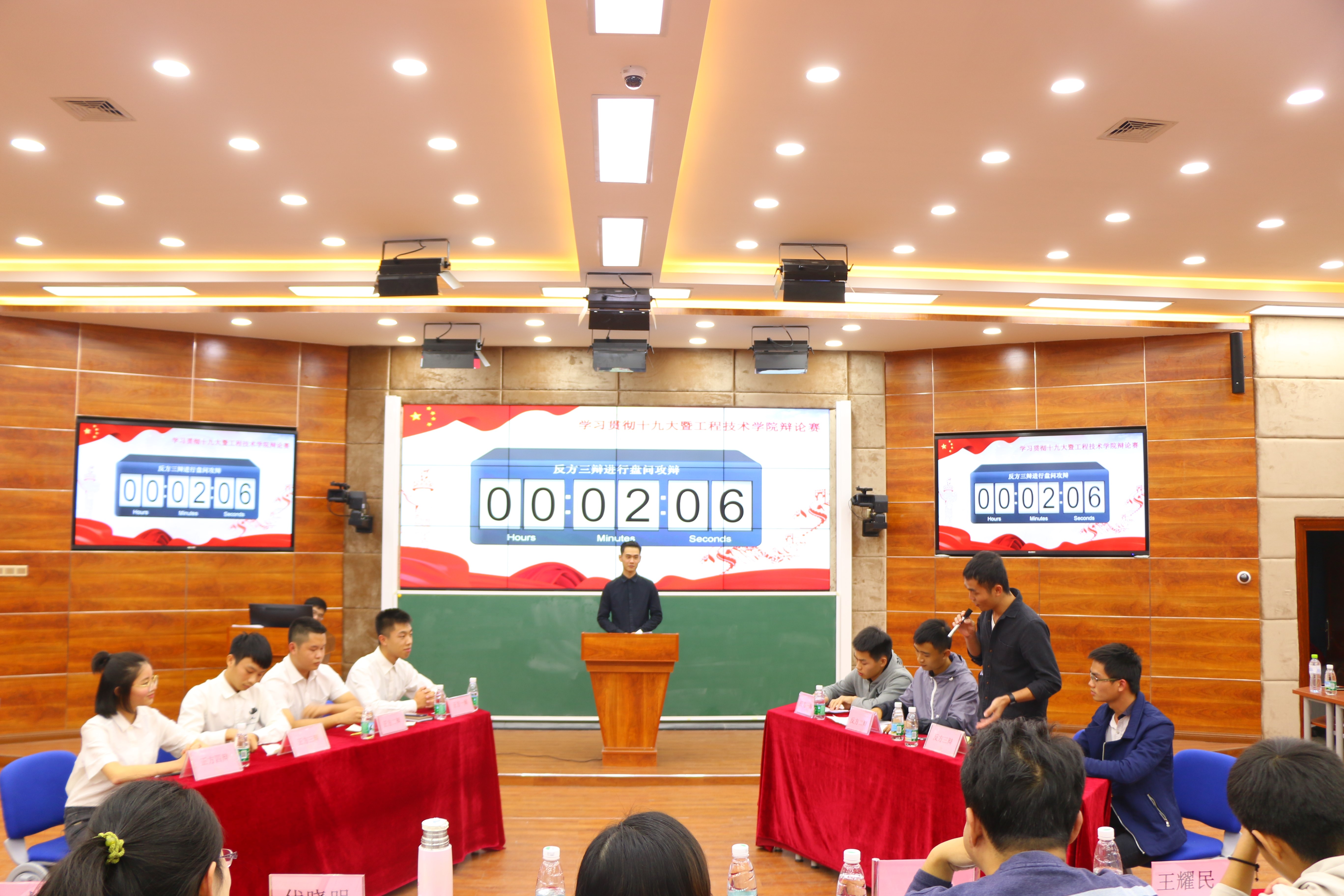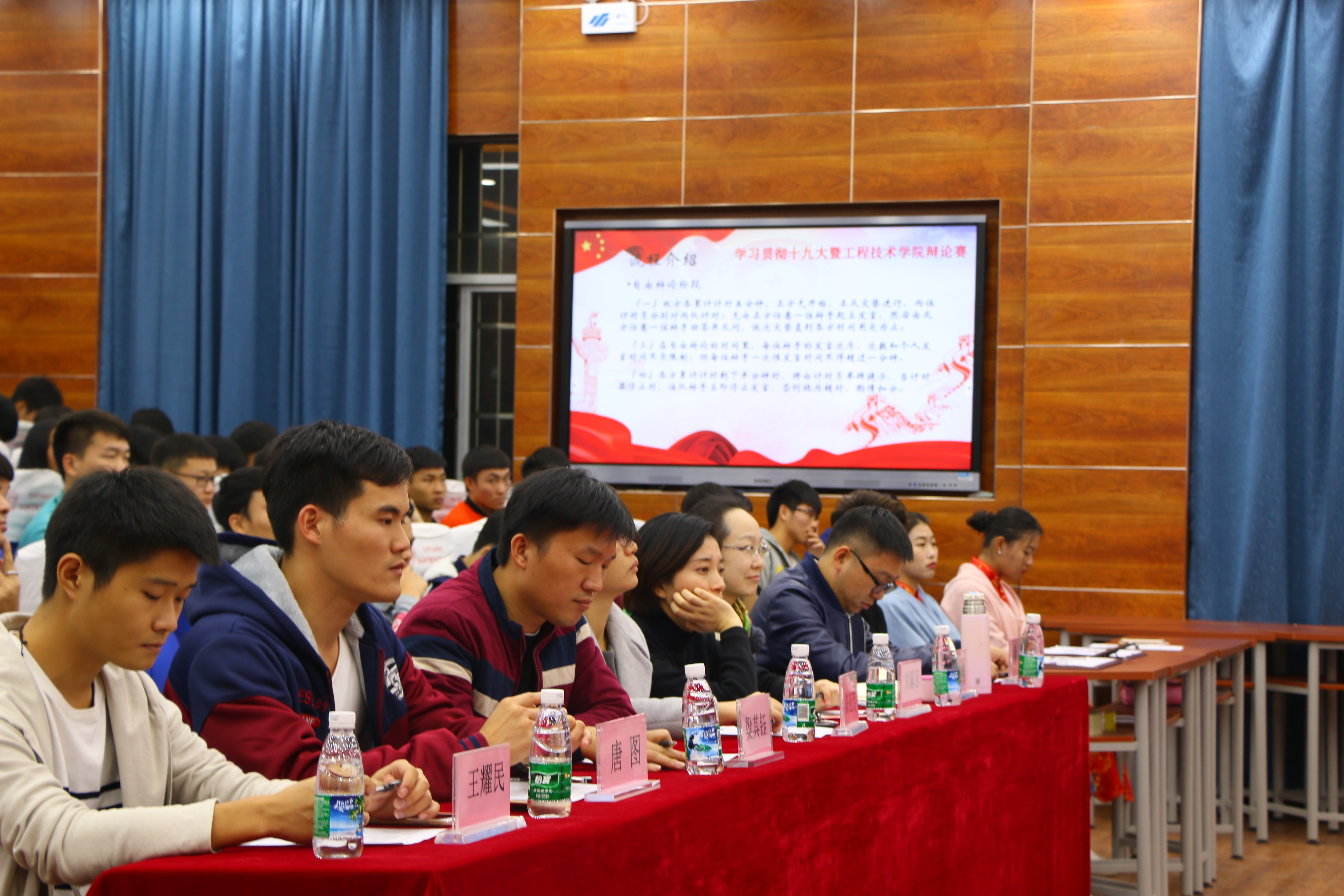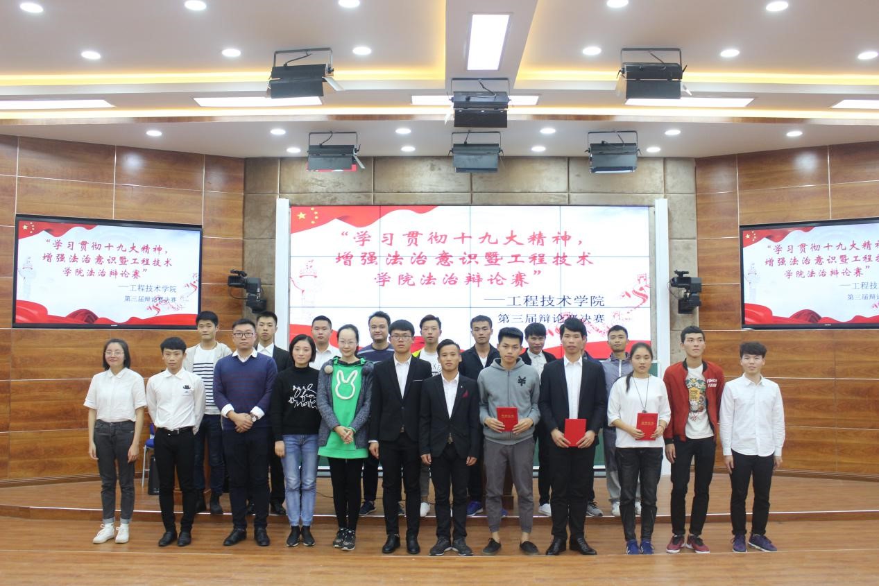 12月19日讯(青年媒体中心 何曼报道)。12月19日晚7:40在第二教学楼215教室进行了主题为“贯彻十九大精神,增强法制意识”的法治辩论赛决赛。到场的有工程技术学院党总支陈亚芳副书记,学工办主任梁其钰老师,学生党支部书记代晓明老师,团学负责人唐图老师,辅导员徐超老师,刘露思老师,蒋晓科老师,第二届学生会主席王耀明。在主持人李斌介绍完规则后,辩论赛正式打响。