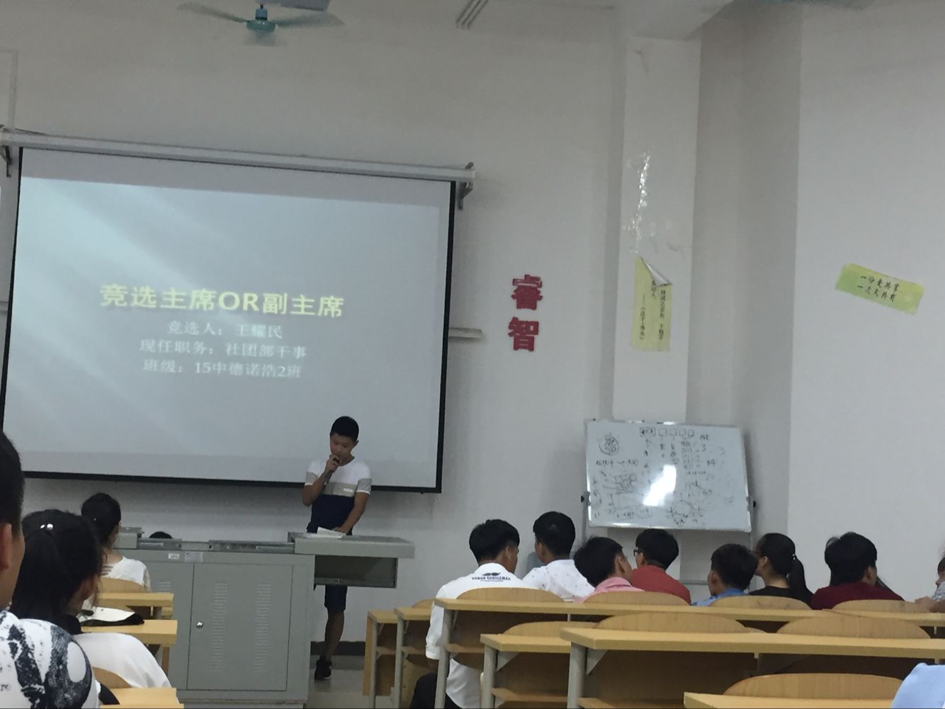 大会首先由团学青代表发言。来自15通信班的岳同学通过对一年的团学青生活的总结,向同学们讲述了初入时的迷茫,困惑,到后来的觉悟与奋起的心路历程,并跟同学们分享了她的收获。然后是学生会主席赵丽发言,赵丽学姐在总结一年工作的同时,也提出了对下一届团学青的一些建议,她希望团学青队伍里能够有更多主动,有热忱的同学加入,一起成长。两位代表发言结束后,换届选举正式开始。俗话说,机遇总是青睐有准备的人,上来竞选的同学们,或通过豪情壮志的演讲,或通过PPT对自己所竞选职位的理解,让大家了解自己的意愿,展示自己的雄心,整个会场气氛一片热烈。竞选结束,团总支书记梁其钰老师总结。梁老师首先表示非常开心看到各位同学能够踊跃参选,同时针对今晚同学们竞选岗位志愿不平衡的现象,他指出,每个岗位都是平等的,而我们学到的东西大多都不是在自己岗位上学到的,他希望同学们能够摆正自己的价值观,清楚自己想要什么,看待岗位要一视同仁,只要是想进步进不怕没有平台。整个大会气氛一片祥和。