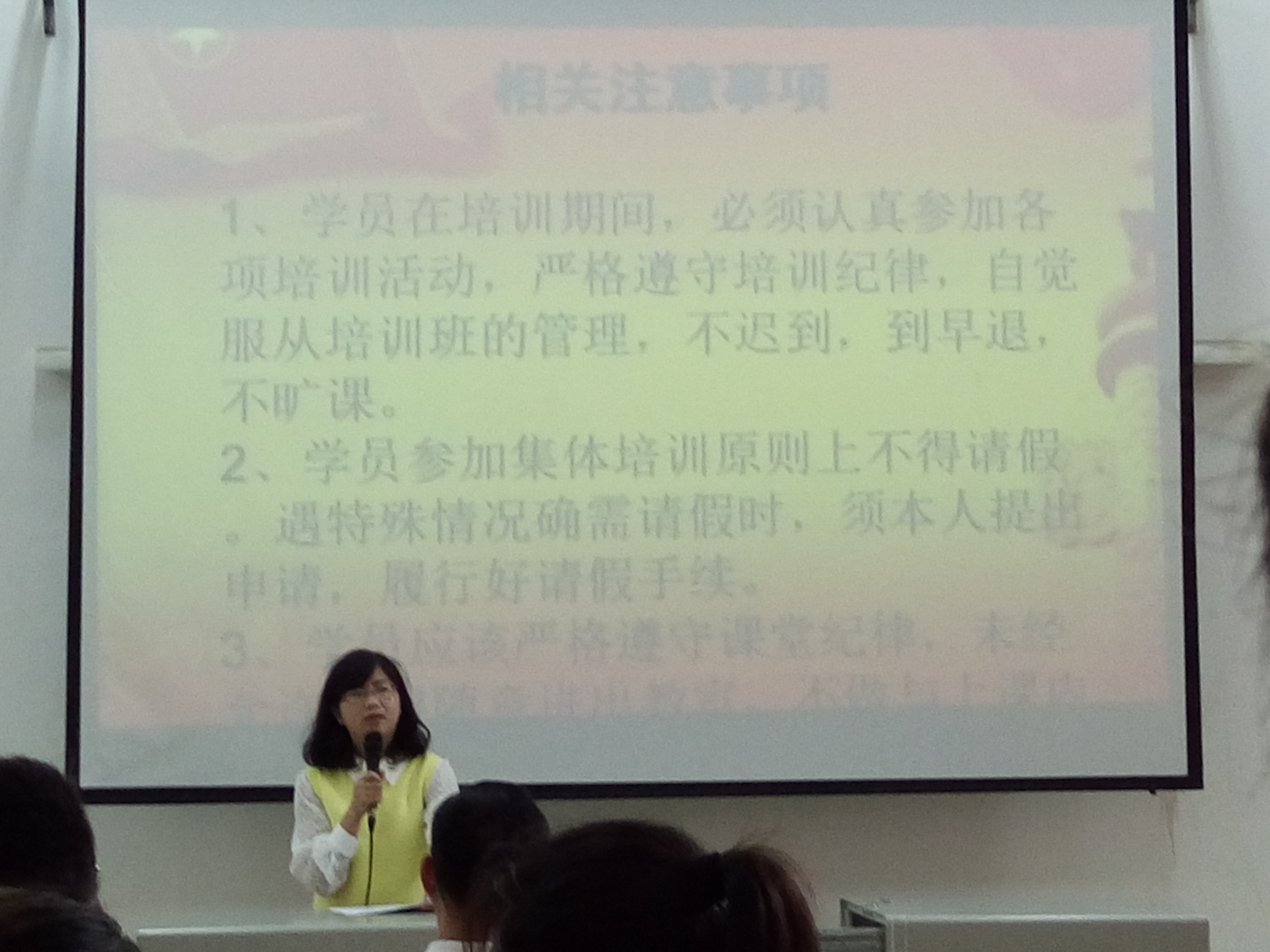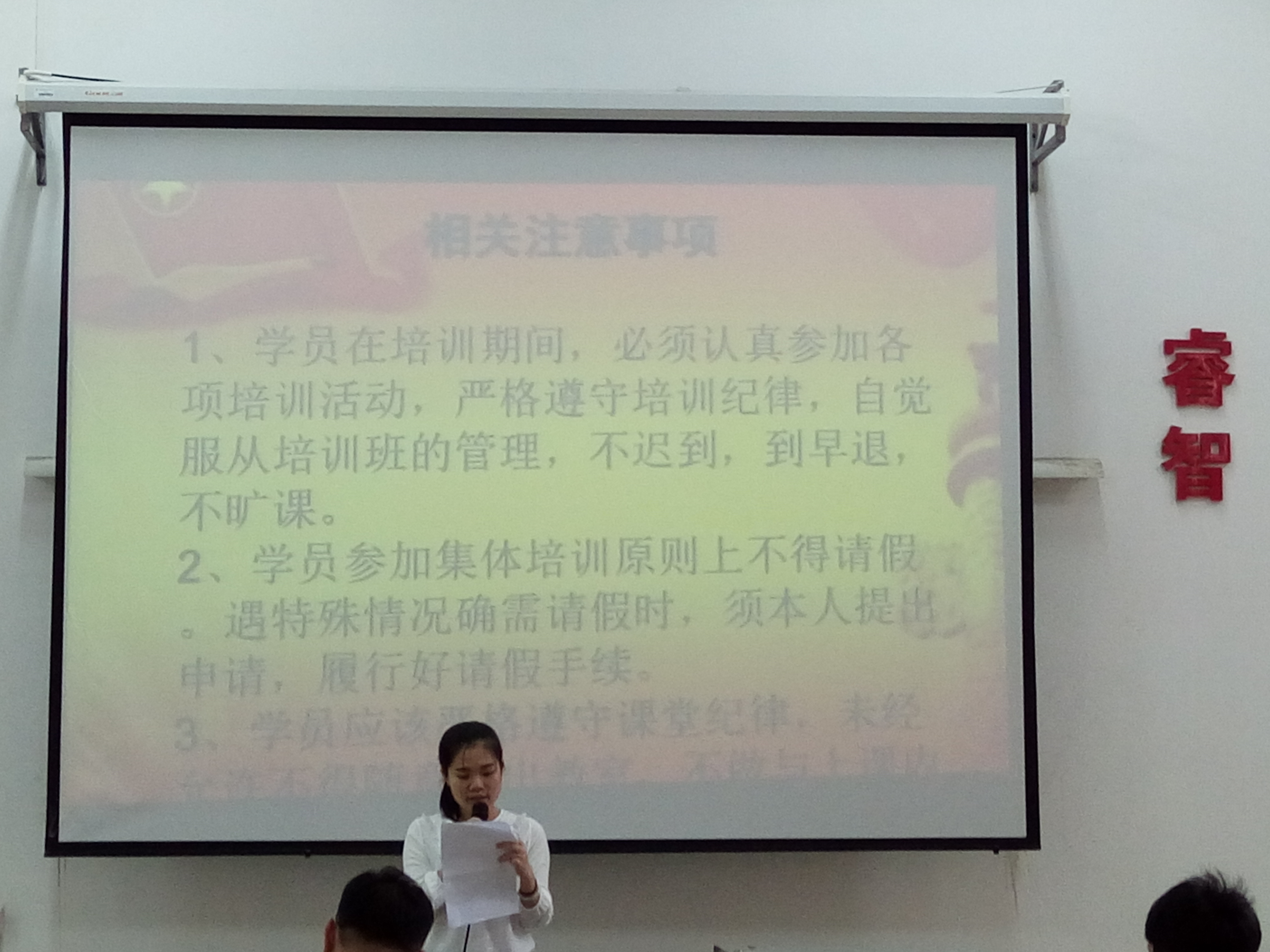 4月19日讯(工程技术学院 李京京报道)为了进一步提升我院学生党员队伍的党性修养,加强对入党积极分子的教育培训工作,4月19日下午3:00在二栋教学楼2526多媒体教室进行了工程技术学院第一期党课培训的开班典礼。参加开班仪式的领导老师分别是党总支书记陈继敏老师、辅导员肖洁老师、辅导员刘芳老师,以及学生团总支副书记朱振通和本期参加党课培训的60名入党积极分子。本次开班仪式由工程技术学院学生党员黄丹主持。