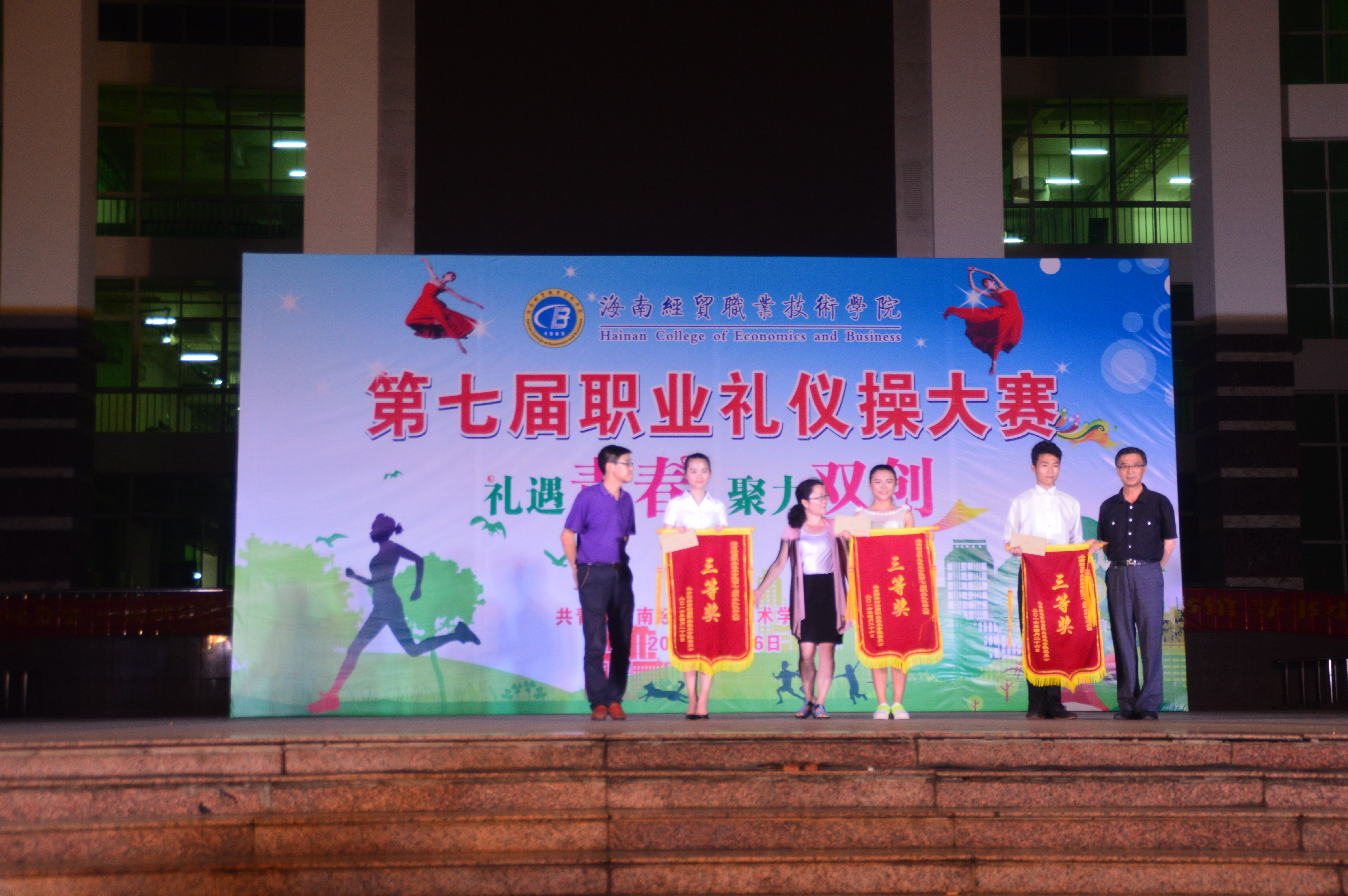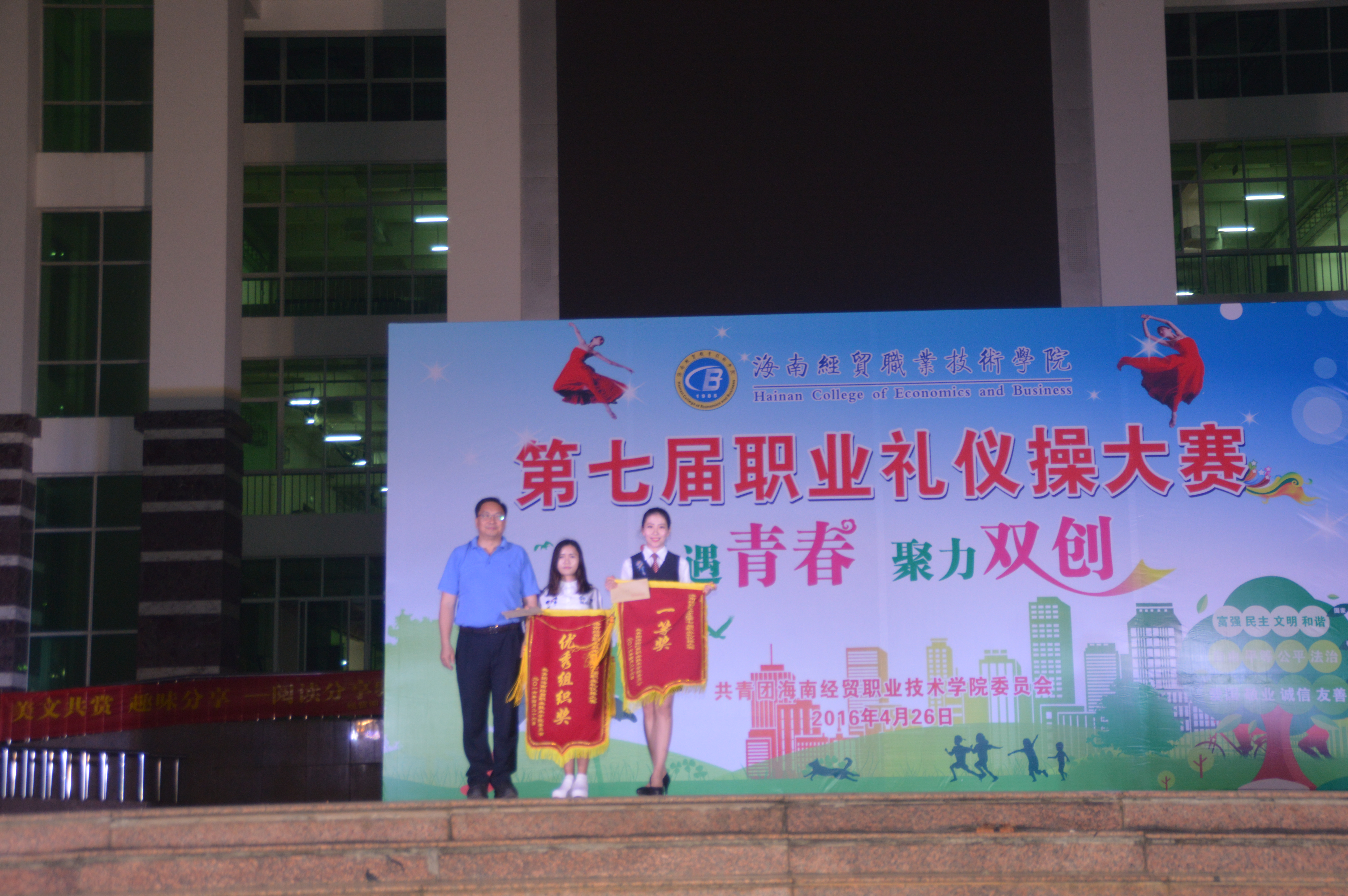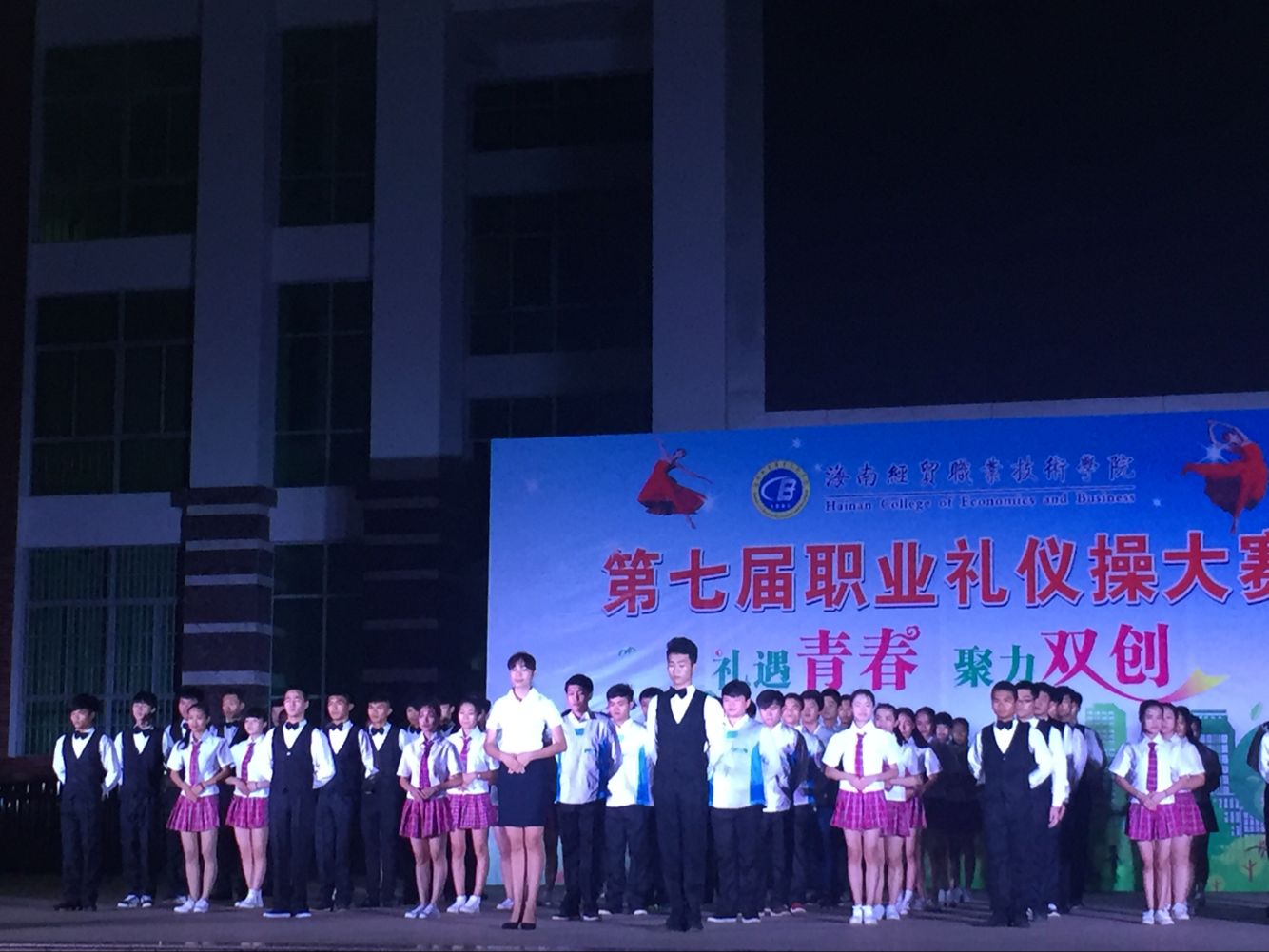 4月27日讯(工程技术学院 李京京报道)为了使我校同学了解“双创”的意义,自觉参与“双创”工作,培养大学生文明礼仪,提高礼仪素养,学校于4月26日晚7:30分在经贸广场举行了以“礼遇青春,聚力双创”为主题的第七届职业礼仪操大赛。我院由100多名同学代表我院参赛。