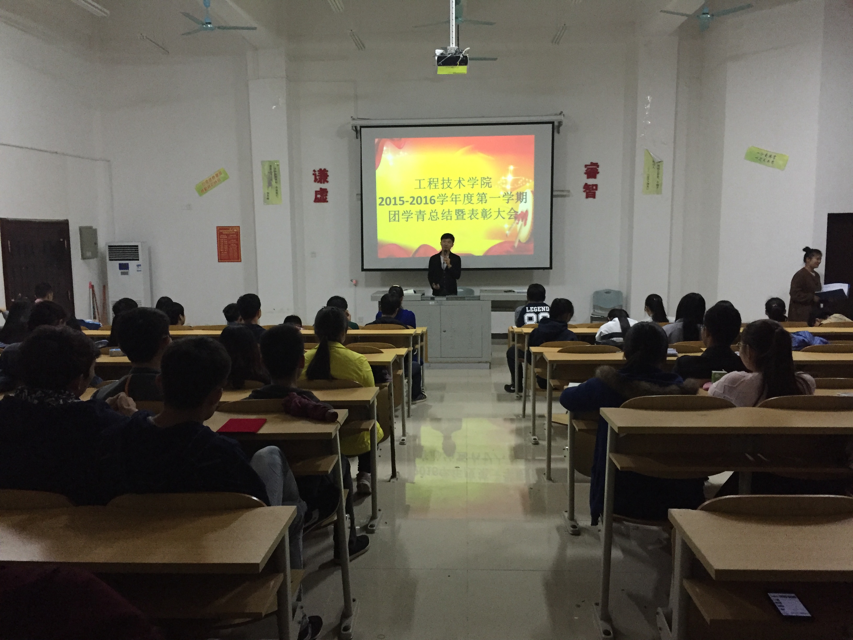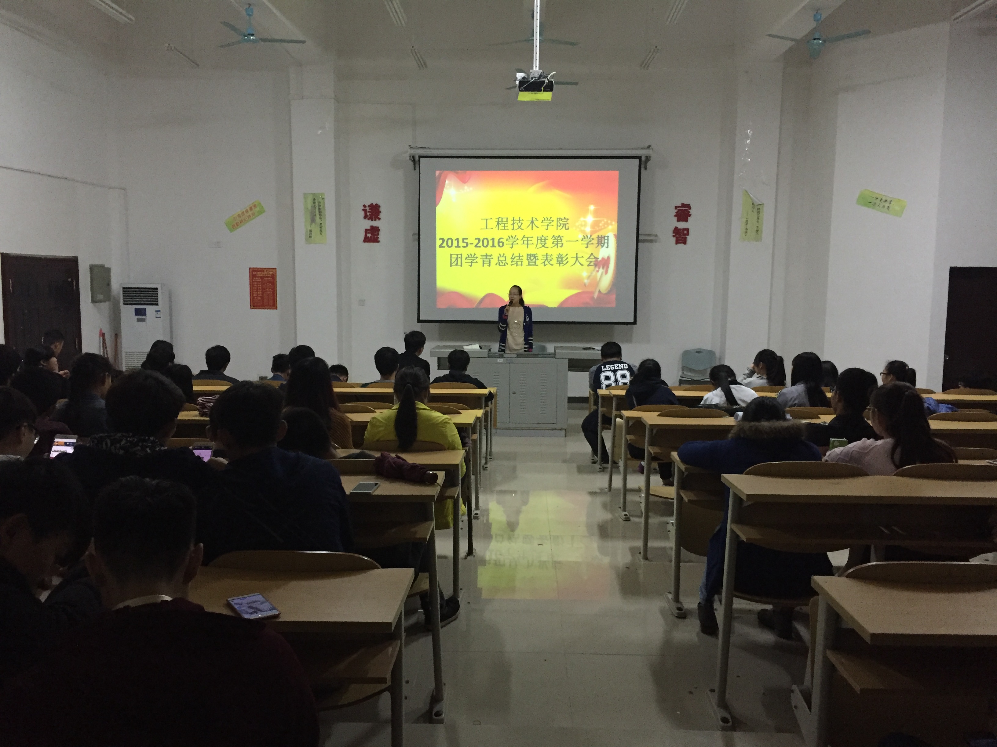 2015年12月27日讯(工程技术学院 李京京报道)12月27日晚8:00整在二栋教学楼526教室举行了工程技术学院2015-2016年度第一学期团学青总结暨表彰大会,参加本次大会的主要有工程技术学院团总支书记梁其钰老师、团学负责人代晓明老师、工程技术学院团学干部以及团学干事成员。大会在陈悄悄的开场白下拉开了帷幕。