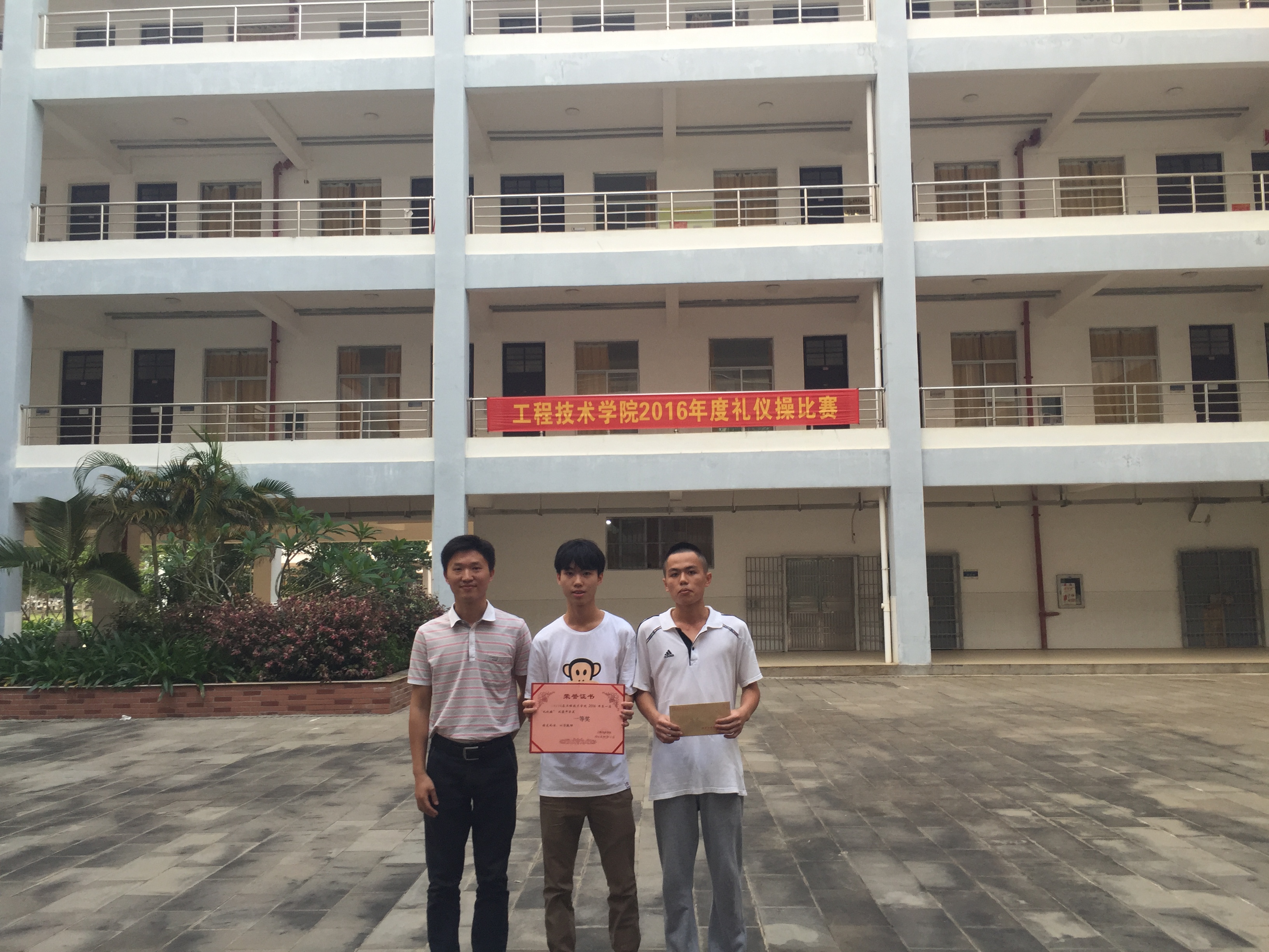 4月12日讯(工程技术学院 李京京报道)为培养学生文明、诚信、有礼貌的良好形象、弘扬礼仪风采,我院在4月12日下午5点整在第二教学楼下举行了工程技术学院2016年度第一届礼仪操比赛。本次比赛担任评委的有工程技术学院团总支书记梁其钰老师、15级辅导员肖洁老师、团学青主席赵丽、副主席叶绵海、副书记朱振通、副秘书长李京京。比赛在主持人容世超的开幕词下拉开了帷幕。