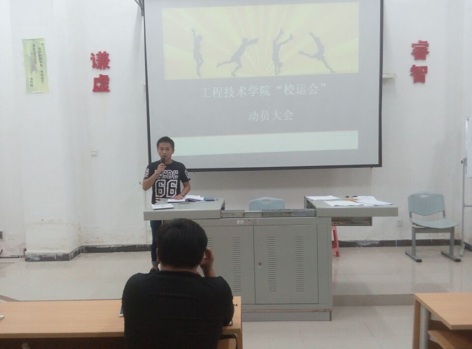 11月13日讯(工程技术学院 李京京报道) 11月12日晚7:30在二栋526多媒体教室举行了“工程技术学院校运会动员大会”。参加本次会议的有工程技术学院团学青负责人代晓明老师、学工办副主任梁其钰老师、团学青全体成员以及14、15届各班班长、体育委员。本次会议由副主席赵丽主持,会议在赵丽的开场白下拉开帷幕。