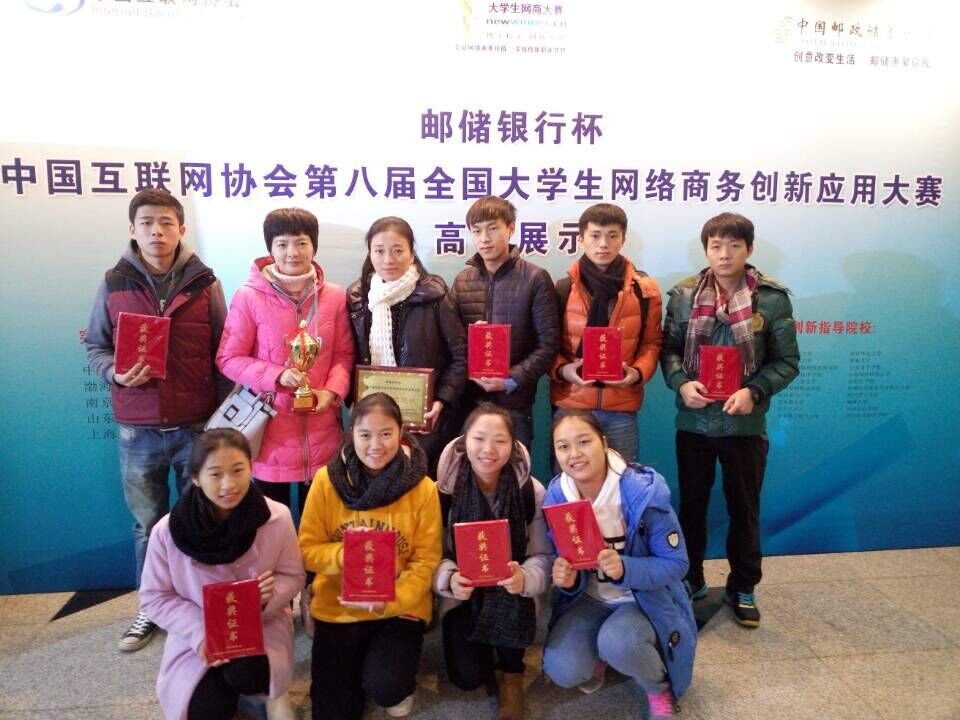 “邮储银行杯”中国互联网协会第八届全国大学生网络商务创新应用大赛于2015年3月开始在线报名并正式启动,在经过紧张的初赛、复赛、分赛区决赛后,于2015年11月28日开始全国总决赛环节,至12月1日颁奖典礼后全部结束。本届大赛共有来自全国近3000所高校的17万名大学生注册报名,组建团队近4000支。经过初赛评审,有 2000余支团队晋级复赛,1000余支团队入围分赛区决赛。经各赛区评委的评审,有来自 200余所高校的300余支队伍晋级全国总决赛。其中本科组队伍共200余支,专科组队伍100余支。海南经贸职业技术学院信息技术系的“追梦”和“响当当”两个团队在众多参赛团队中脱颖而出成功进入到全国总决赛,其中“追梦”团队在华南赛区中夺得了特等奖,全国决赛中两支团队的成员表现突出,分别夺得商务模式创新类二等奖和网络营销策划类二等奖,成绩喜人。同时,由于本校参赛选手们在华南赛区和全国赛区的突出表现,以及李小玲老师连续六年来持续组织学生参加该项比赛,我校被评为“优秀组织院校奖”。