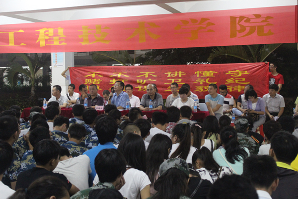 接下来,由陈继敏书记对学生到校承诺以及军训期间具体安排进行了详细说明。书记通过讲一些历史事件让同学们懂得纪律的重要性,明白没有铁的纪律,就没有钢的成就。针对我院工科学生的特点,特地制定了新生纪律制度,守纪律、懂礼貌、讲卫生、不旷课、不打架、不赌博,让每个新生在横幅上签名,承诺自己一定会做到这几点。最后,会议以全体成员庄严宣誓画上了圆满的句号。