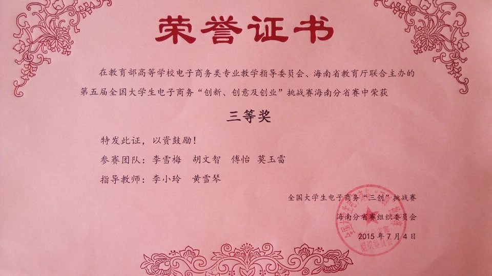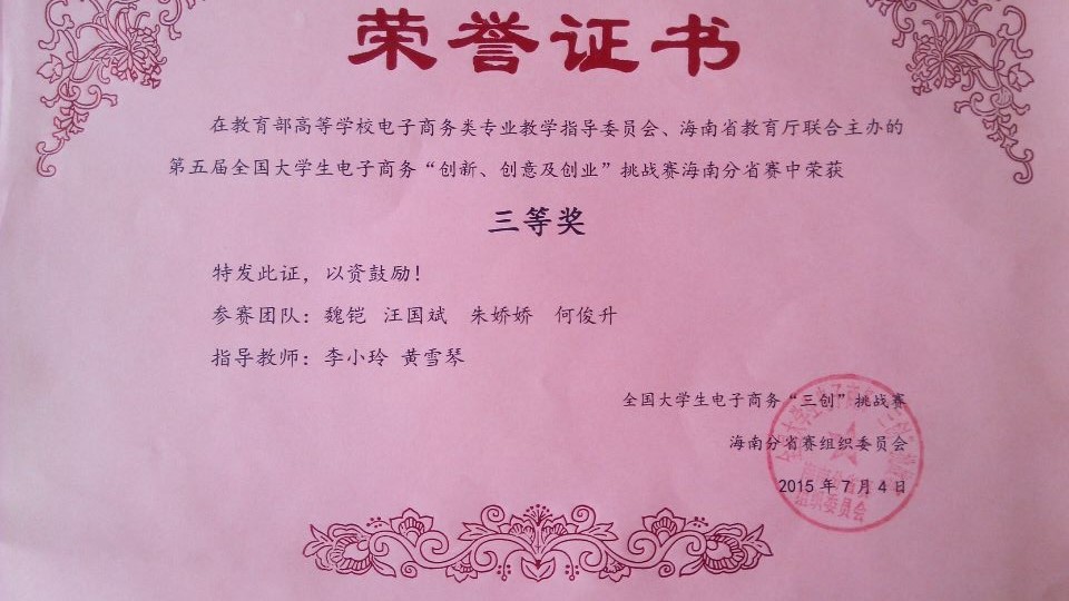 由教育部高等学校电子商务类专业教学指导委员会、海南省教育厅联合主办的全国大学生电子商务“创新、创意及创业”挑战赛(以下简称“三创赛”)海南分省赛于2015年7月4日在海南大学顺利进行。来自海南省内的35支队伍参加了该项比赛,由我院李小玲老师和黄雪琴老师指导的“玫瑰余香”项目团队和“四季优美”项目团队均荣获三等奖的好成绩。