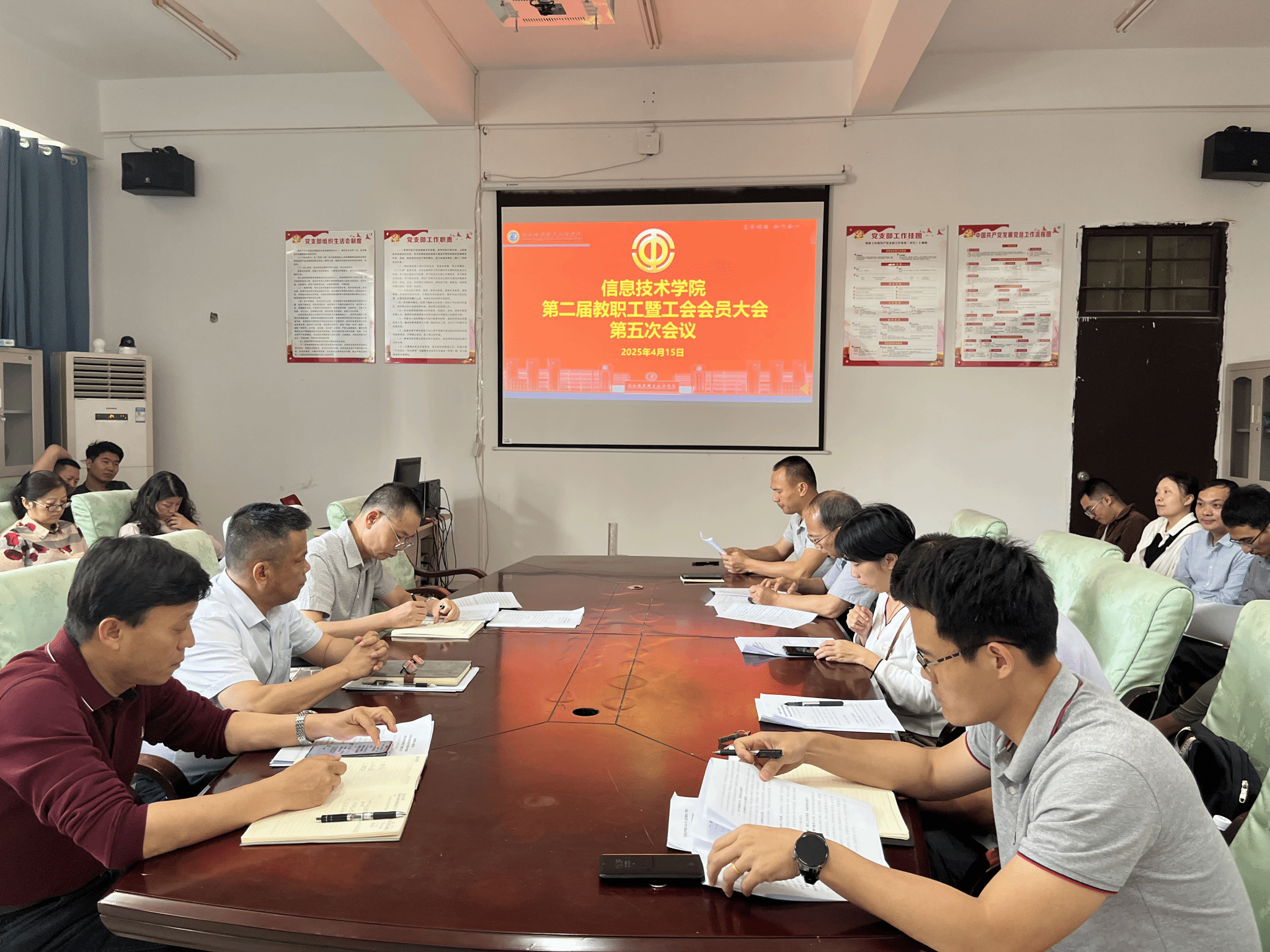 4月15日下午,太阳网集团tcy8722在4-213召开第二届教职工暨工会会员大会第五次会议,会议由党政办副主任韩昌豪主持,太阳网集团tcy8722党政领导及全体教职工参加。