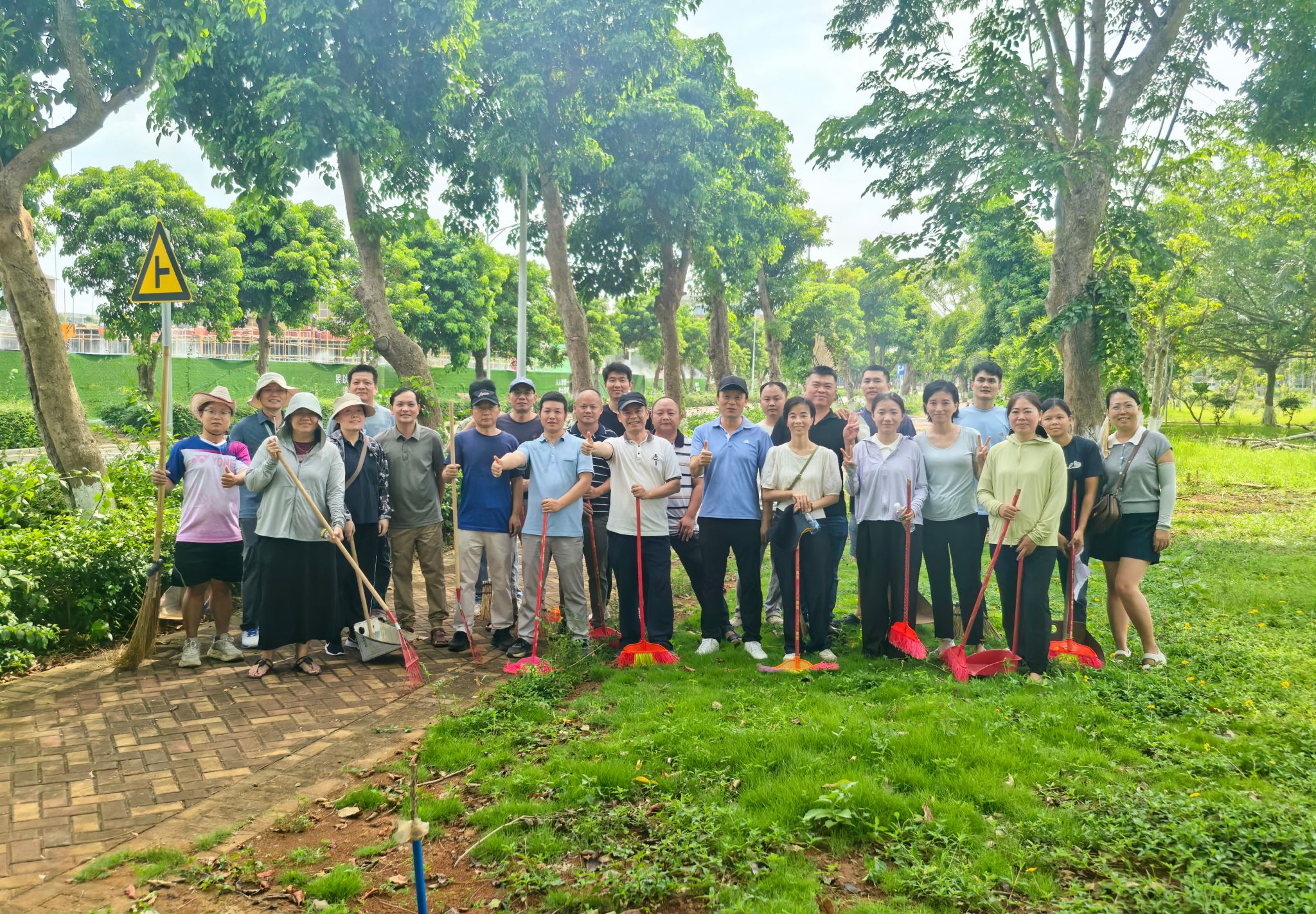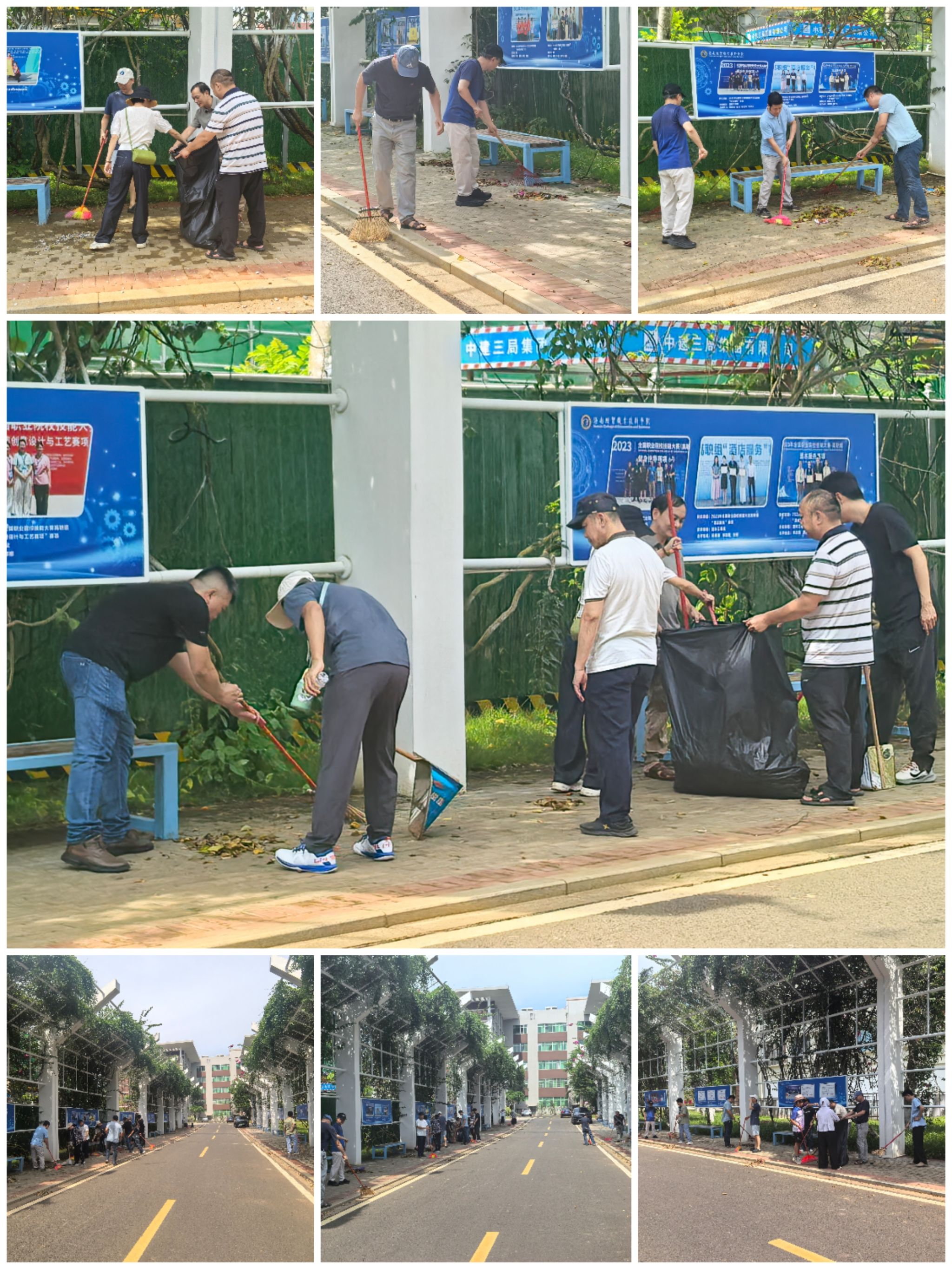 活动现场分工有序,教职工们专注地清扫着路面及绿化带里的落叶,仔细清理每一处卫生死角,每个人都干劲十足,用实际行动为校园洁净贡献力量。经过一番辛勤劳动,负责区域的落叶被清理得干干净净,环境焕然一新。活动最后,全体参与教职工合影留念,定格下这一充满意义的瞬间。