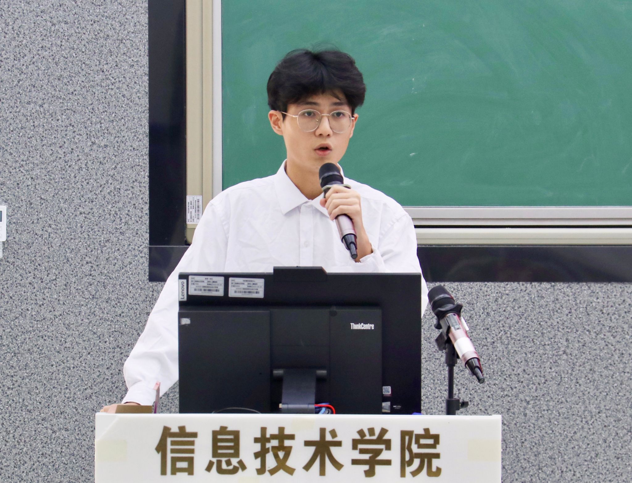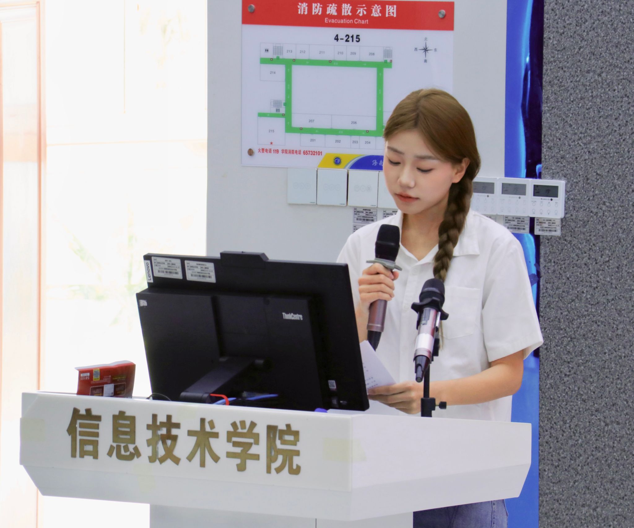 数字媒体技术专业董阁副教授作为教师代表发言。他以阅兵精神激励新生:个人成长与国家发展同频共振,选择信息技术,就是选择与未来对话,他叮嘱新生四个要做,常去图书馆、坚持锻炼、合理使用网络、养成良好习惯,并希望大家在未来三年锻炼专业能力、团队能力、坚韧品质,用代码书写青春,用智慧创造未来。