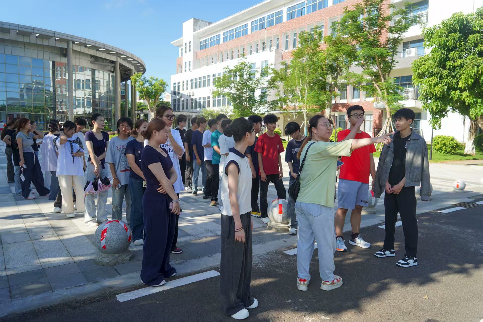 从四教出发,首站抵达的是呈对称分布的一教和二教,这里是思政、英语公共课的主阵地。代班对照指引标识帮新生熟悉位置,化解上课找楼的困扰。随后一行人先后前往三教、五教和六教,代班特别说明,三教、五教、六教主要供其他学院使用,若有跨学院活动,需提前规划路线,避免耽误时间。