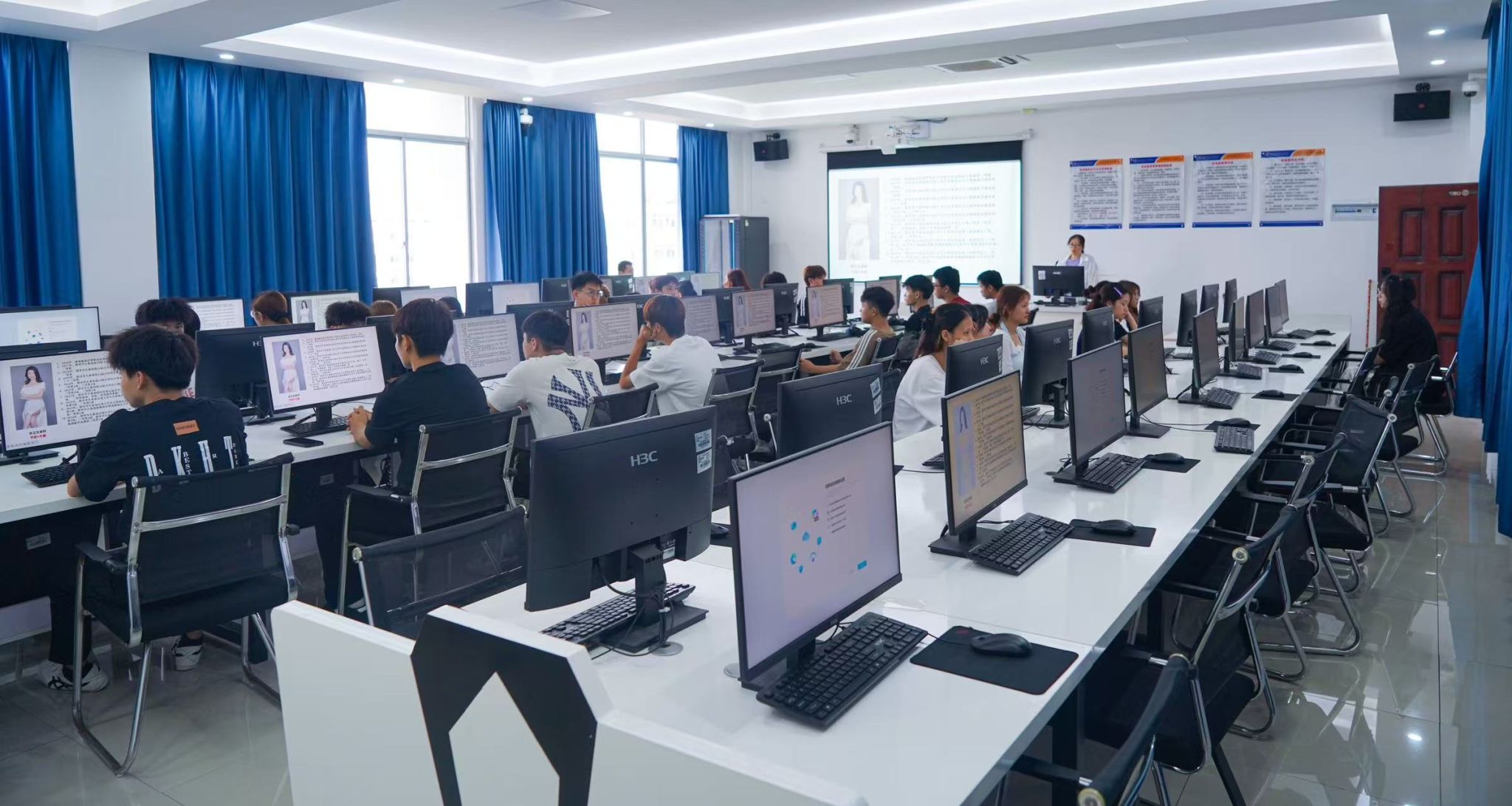 该专业为国家现代学徒制试点,在4-501实训教室,专任老师围绕影视制作全流程、UI设计核心要点开展知识讲解,同步介绍校企合作培养模式,超95%的专业对口率让新生对职业发展路径一目了然。